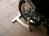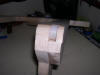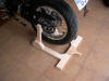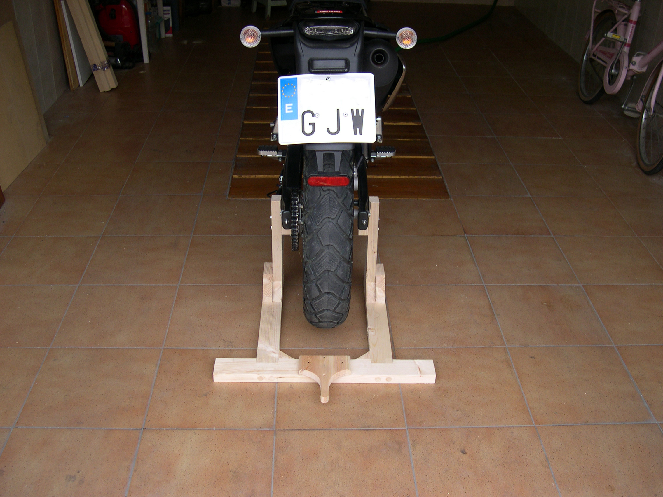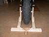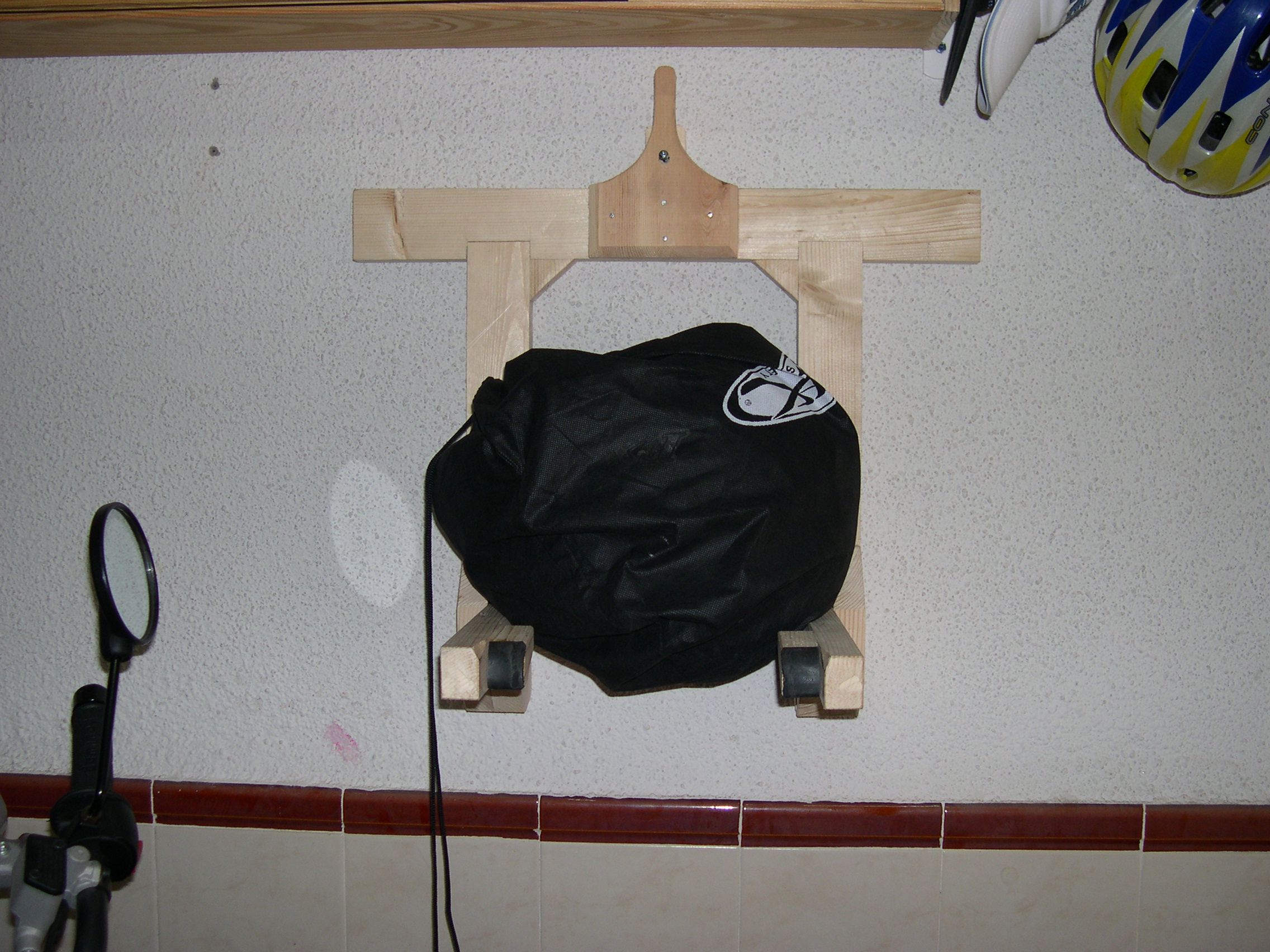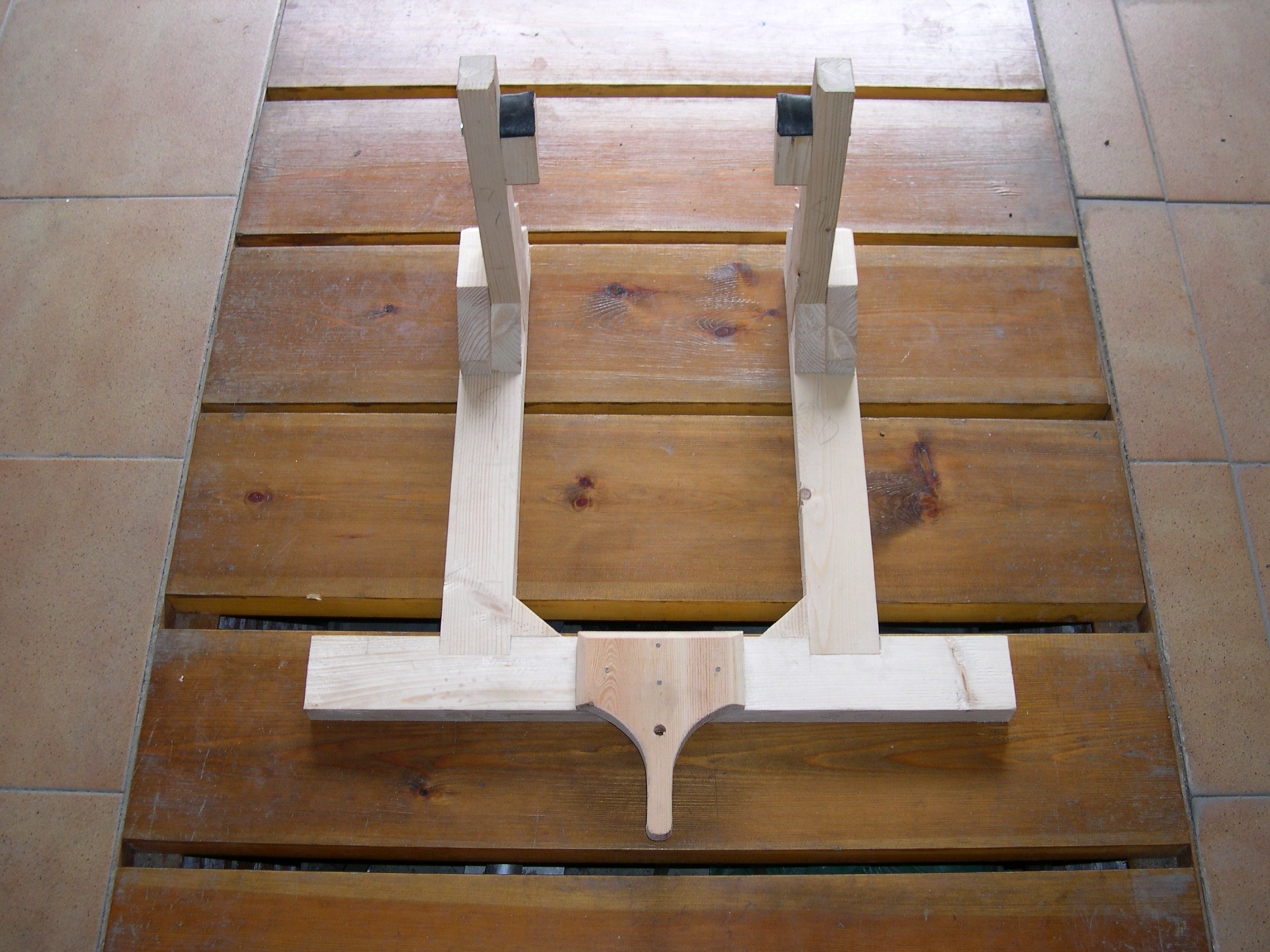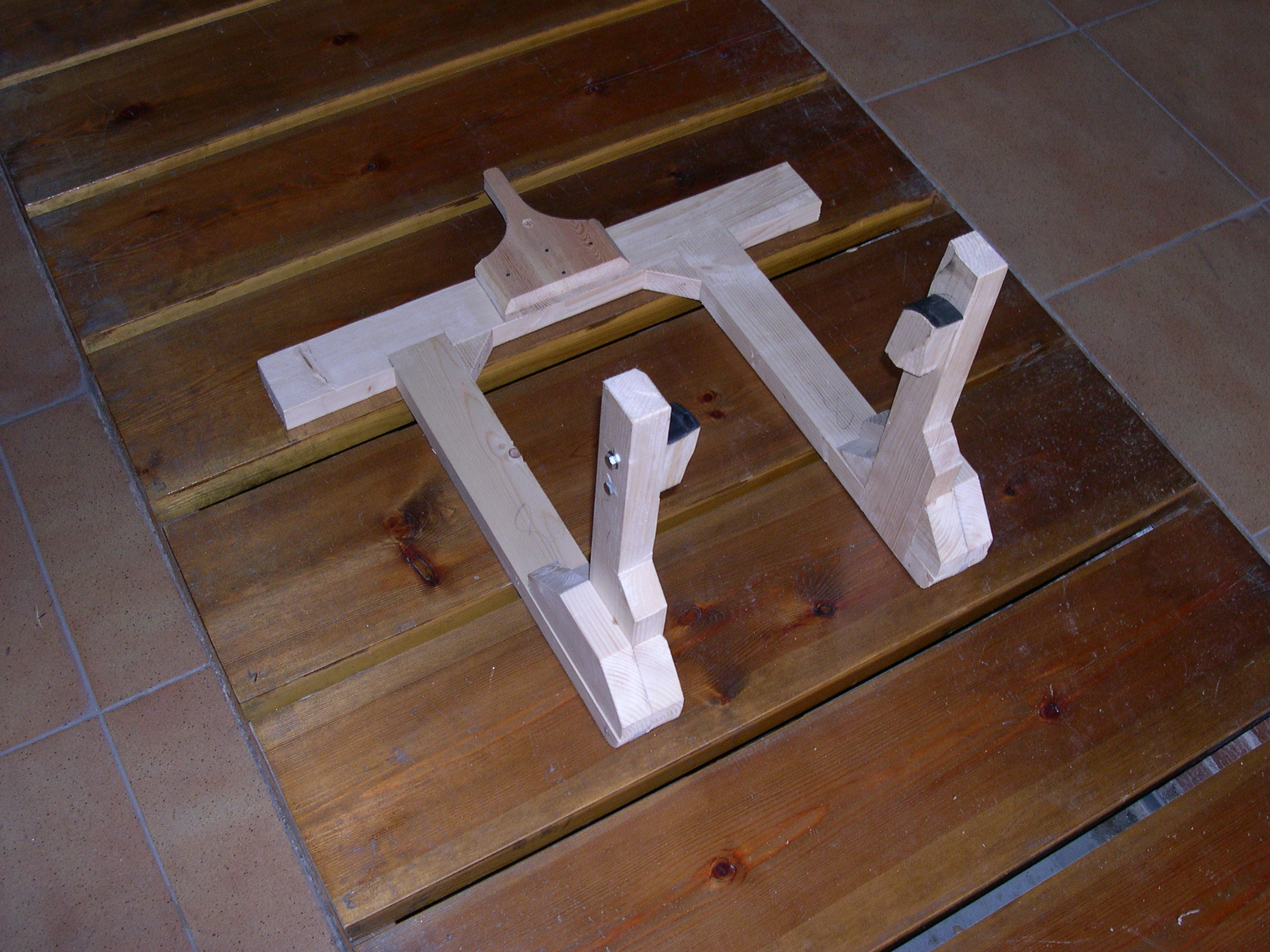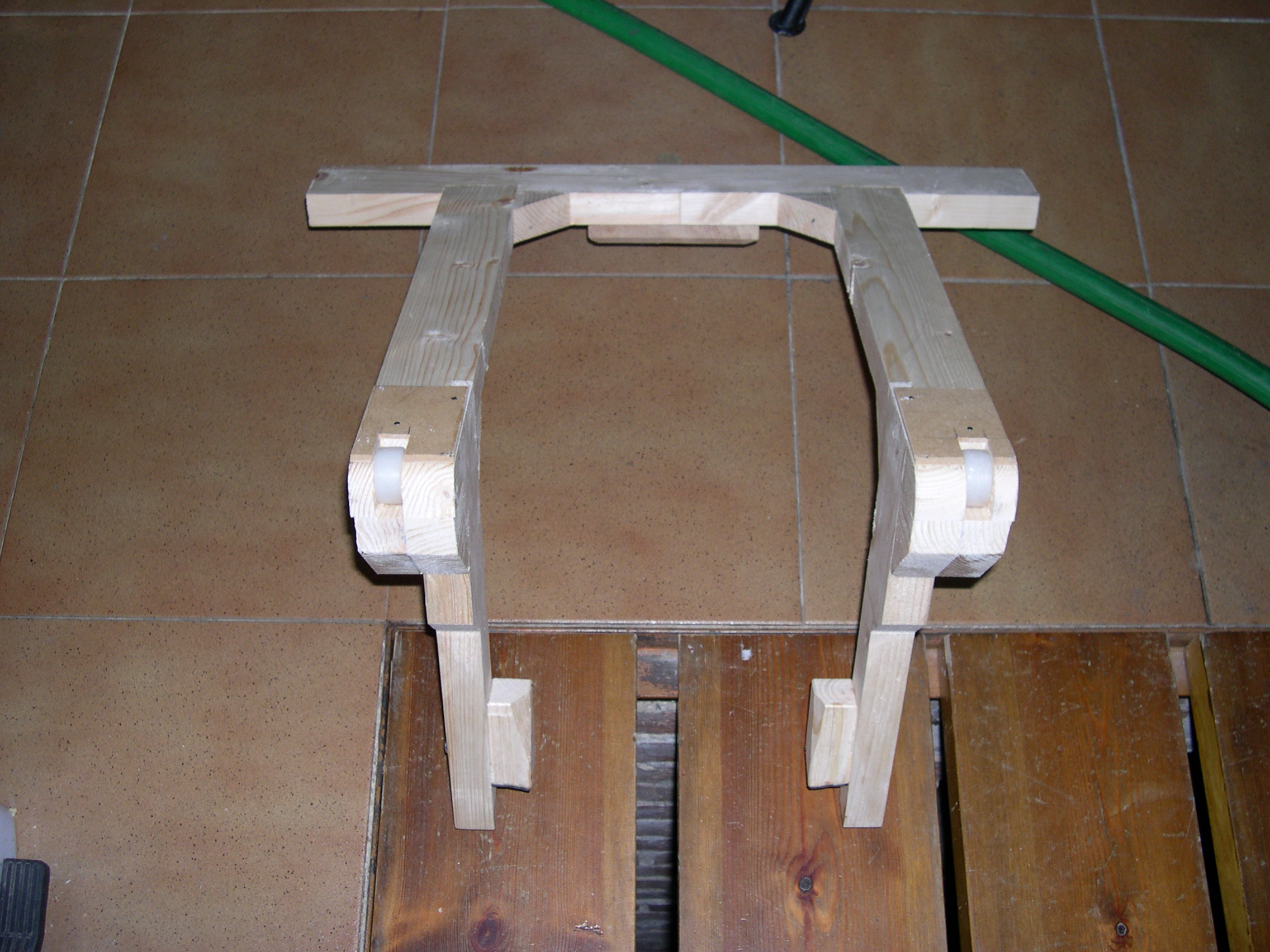 Madera de pino uniones con espigones, reforzadas con escuadras y palomillas de madera, apoyos forrados de goma y ruedas torneadas en nylon.
