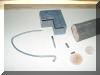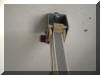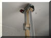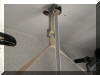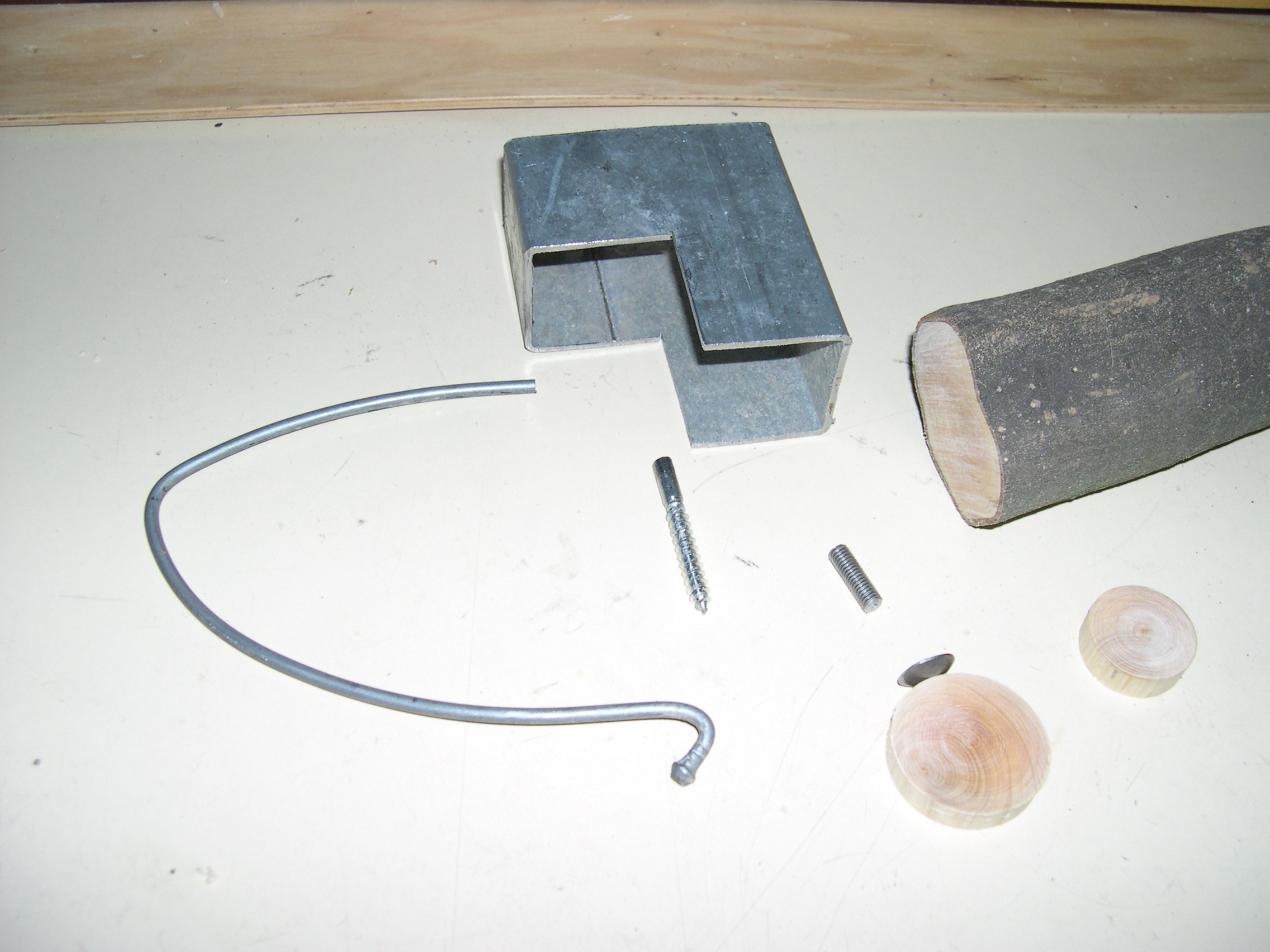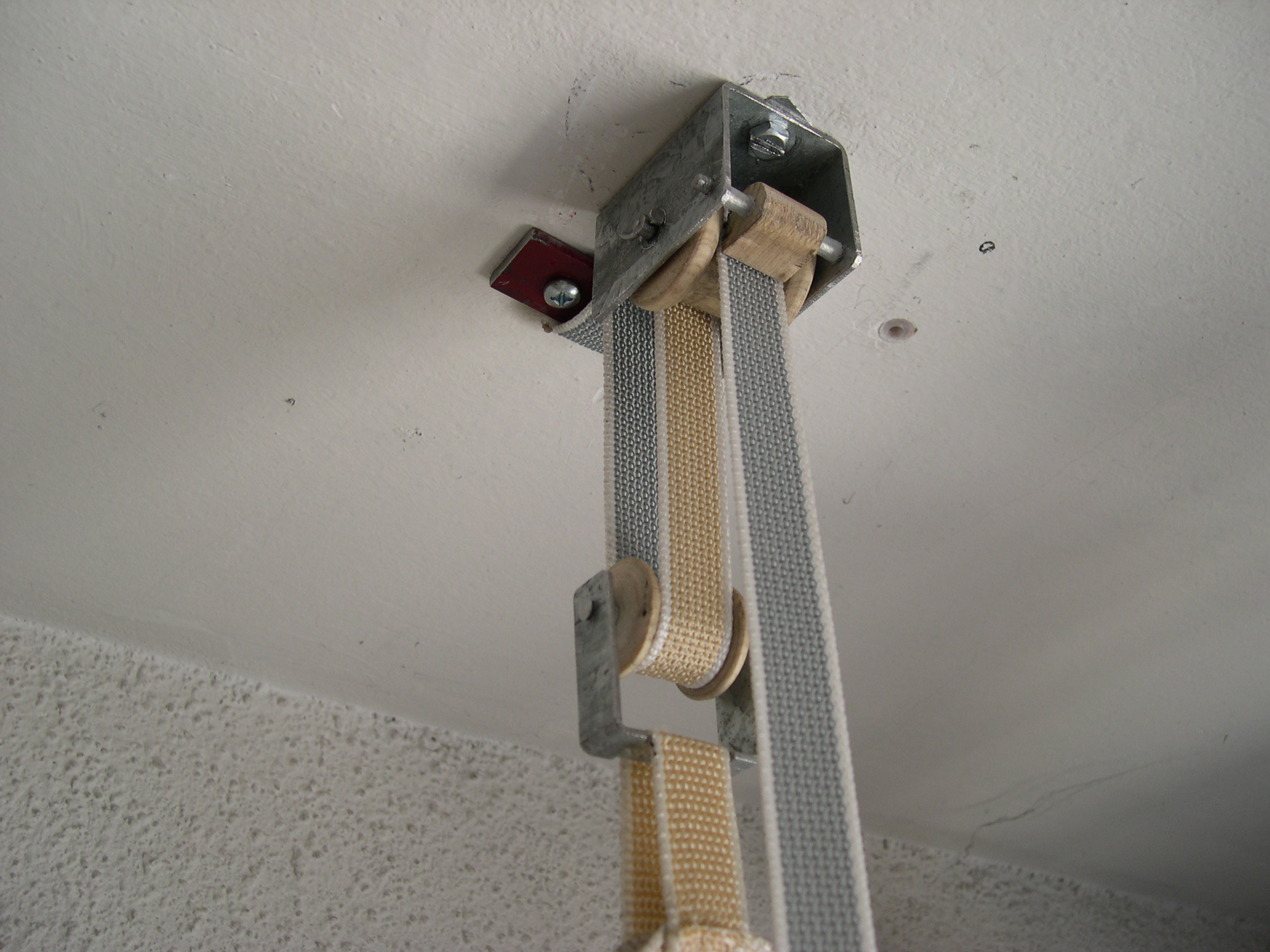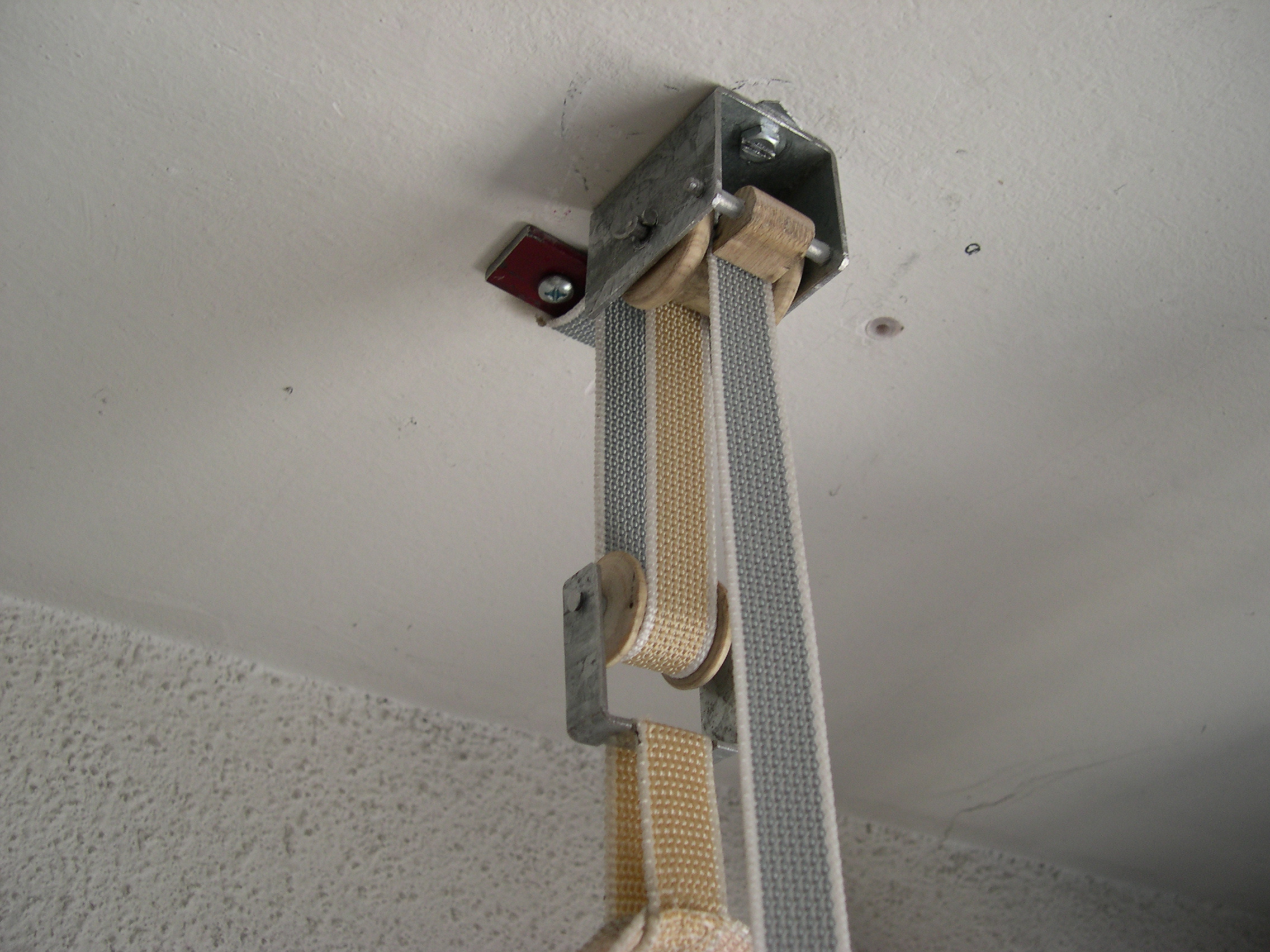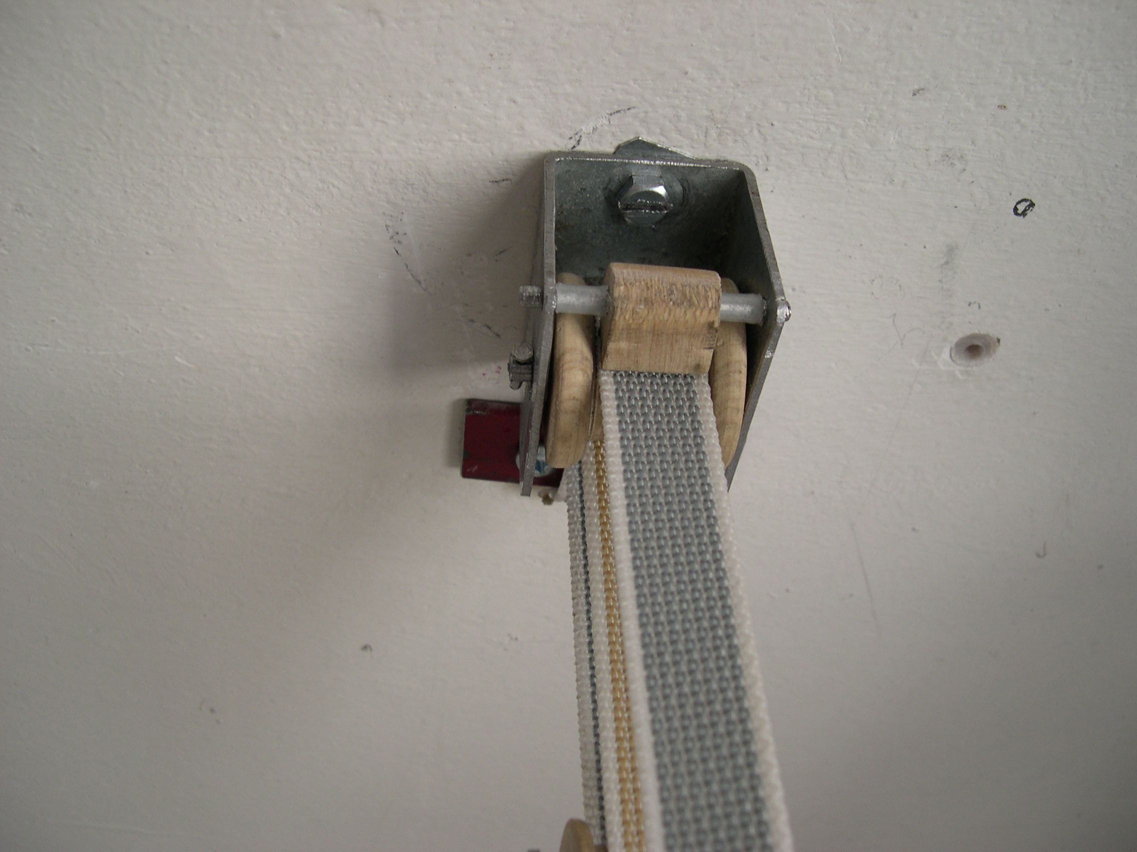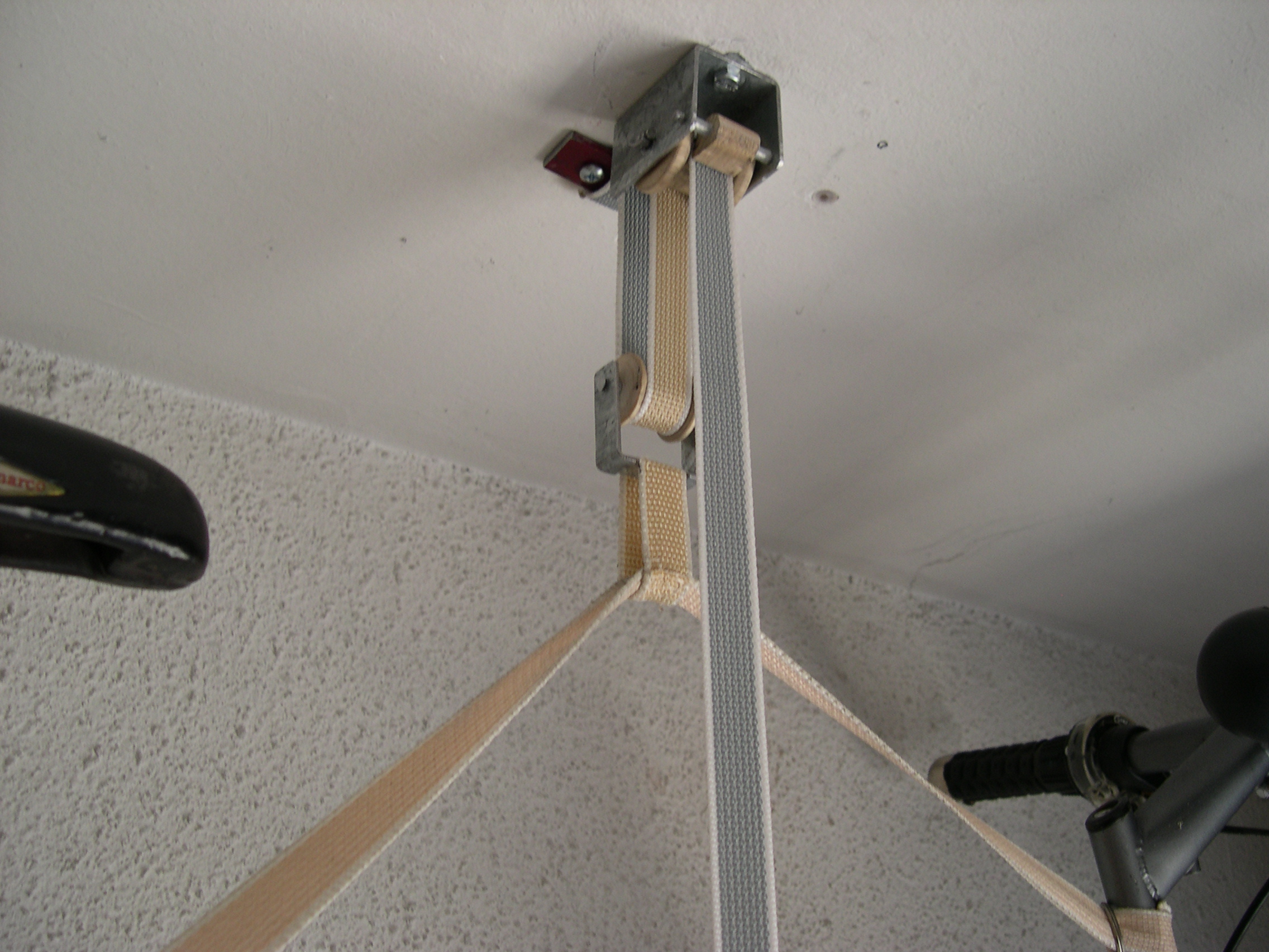 Colgador de techo de bicicleta con doble polea, construido con una cinta de persiana. Las poleas estas torneadas utilizando un trozo de rama de olivo, los soportes de las poleas se han sacado de un trozo de tubo de hierro galvanizado y los ejes del asa de un cubo y de la parte lisa de un tornillo de cabeza redonda. Para tornear las poleas se utiliza un taladro eléctrico, se corta un trozo transversal de la rama de olivo al que se atornilla el trozo de tornillo de rosca madera que se ve en la primera foto, dejando la parte lisa para agarrar la pieza de madera en el taladro.