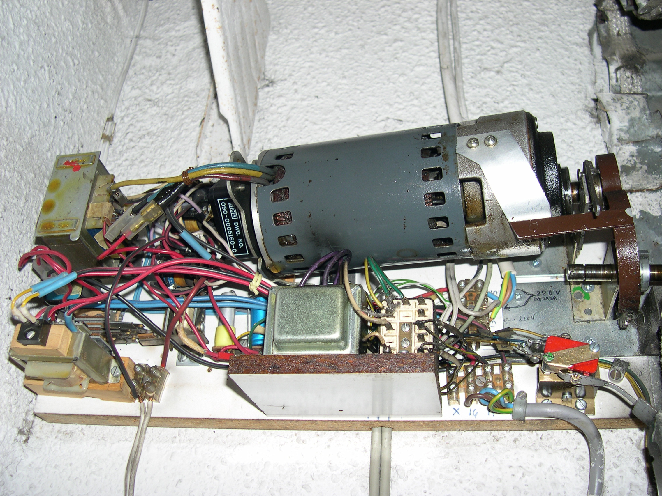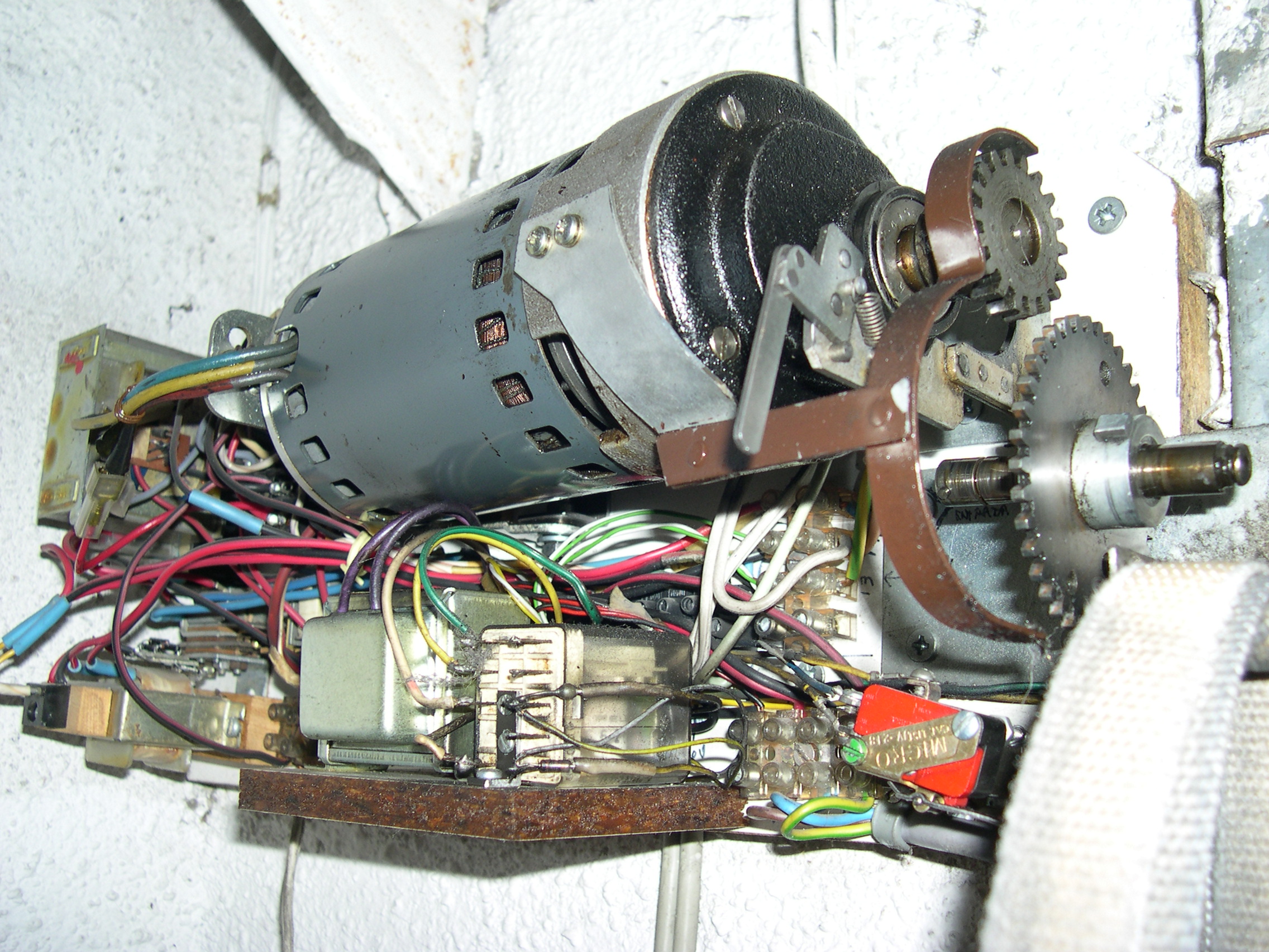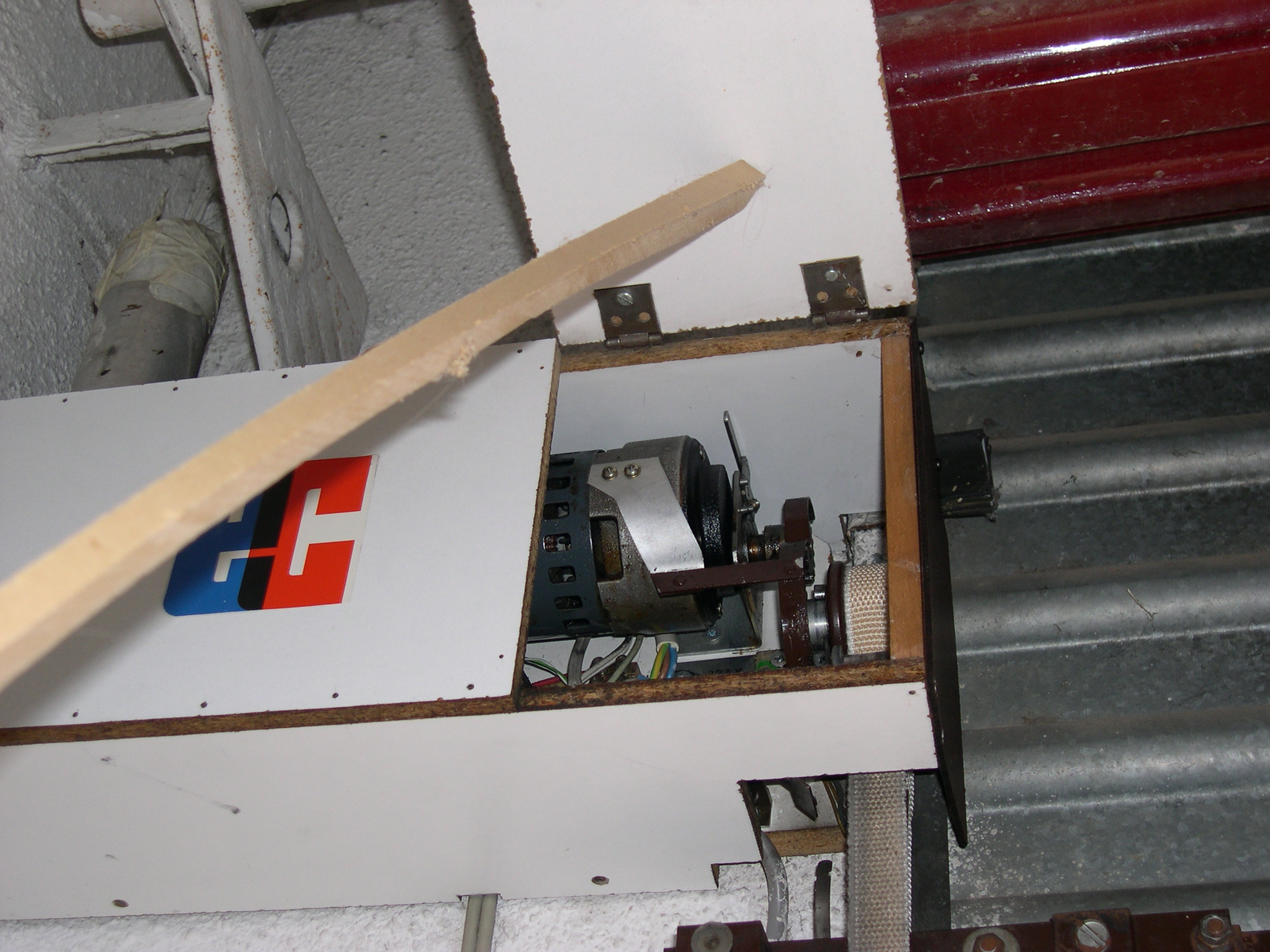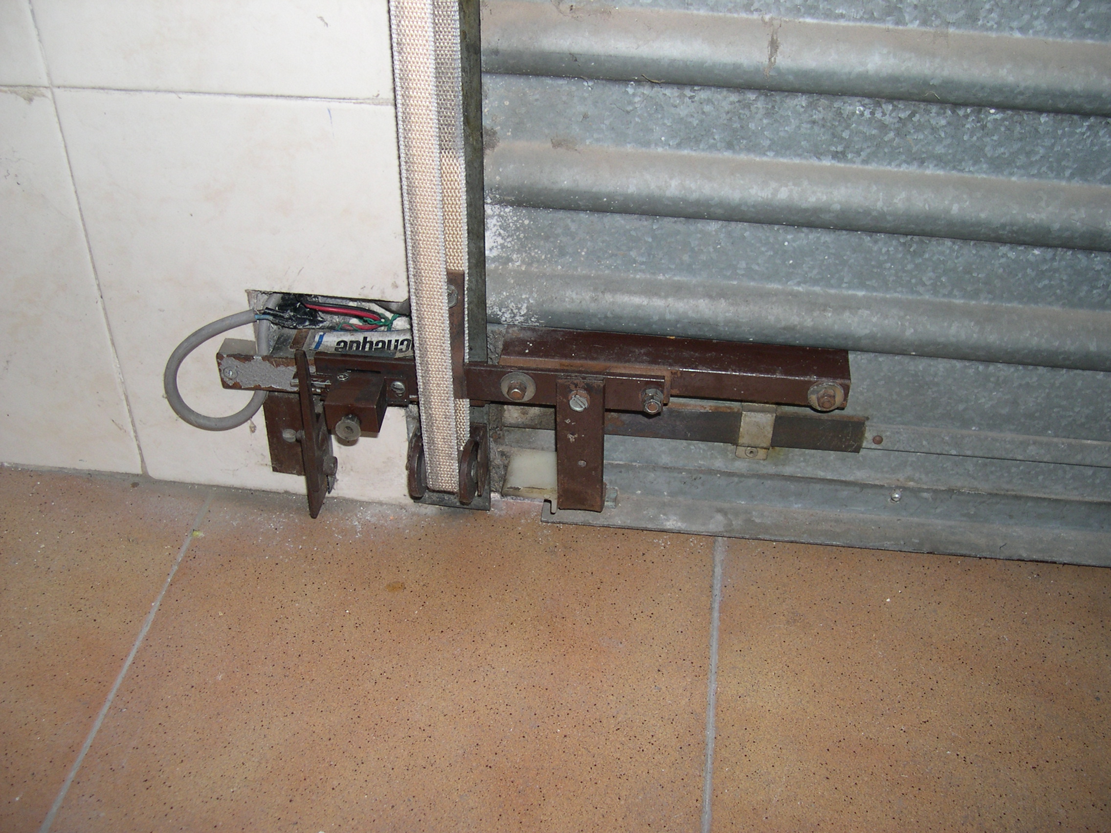 El motor es de una máquina de contabilidad NCR, desechada, tiene una potente reductora que transmite su fuerza mediante engranes dentados, protegidos, que se pueden desacoplar para liberar el cierre. Todo el conjunto está gobernado por unos contactores desechados de otra máquina de contabilidad, relés y contactos electromagnéticos caseros montados en piezas de madera y alimentados por fuentes hechas con transformadores, puentes de diodos y condensadores. Para evitar el arranque en carga, el rodillo de arrastre recibe la fuerza del motor, cuando este ha dado media vuelta para cambiar el sentido de giro, arrastrando la cinta de persiana, tensada con un muelle que está sujeta firmemente a la parte baja del cierre con un mecanismo dotado de resbalón. Por la disposición del muelle que tensa la cinta, si la puerta baja y se encuentra con un obstáculo, el muelle se estira y alarga la cinta que patina sobre el rodillo de arrastre. Al subir, el muelle se contrae mas con el esfuerzo y tensa la cinta evitándose así que patine. El elevador se activa con un mando a distancia desde el exterior y también mediante un teclado con clave cifrada hecho con las teclas de una calculadora, que manda sus pulsaciones a una centralita CASERA, que activa relés en serie hasta completar la clave que da mas de 50.000 combinaciones, siendo modificable la clave mediante el cambio de postura del enchufe de los cables, como si fuera una centralita telefónica con operador, antigua. No se fotografía el interior de la Centralita, que es una caja de chapa de zinc que se aprecia en una de las fotos, para no desvelar su secreto. El conjunta lleva funcionando a diario mas de 15 años sin problemas, tan solo ha habido que reponer la cinta de persiana y la goma que recubre el rodillo de arrastre.
