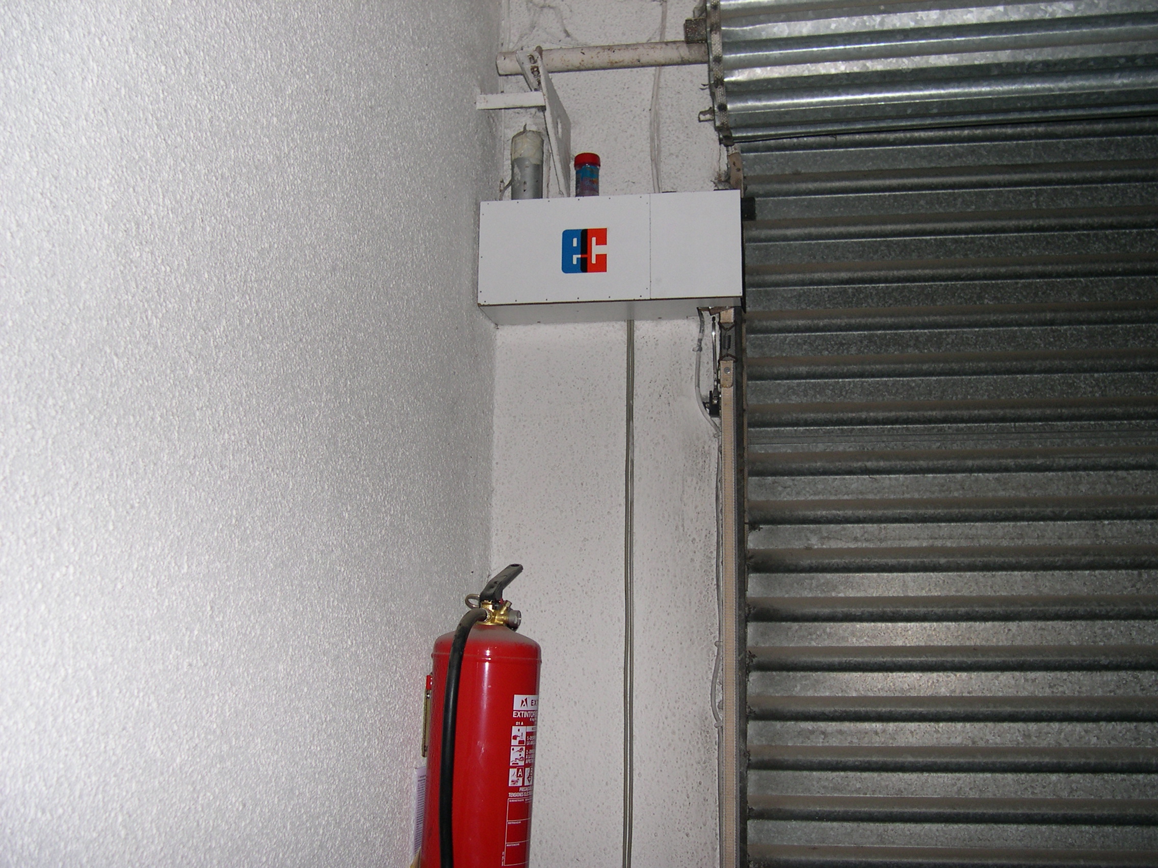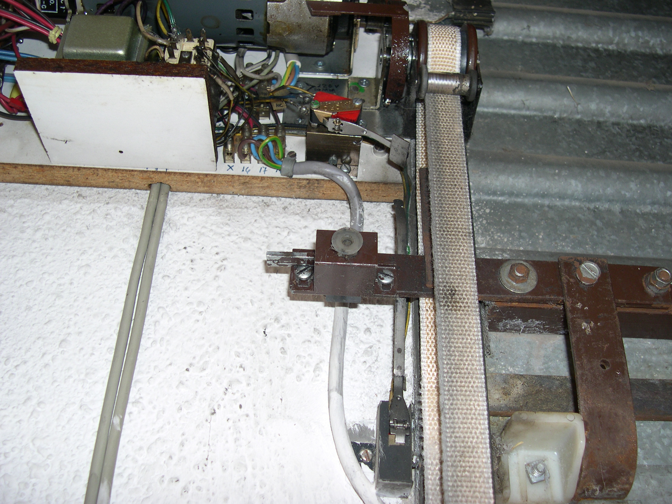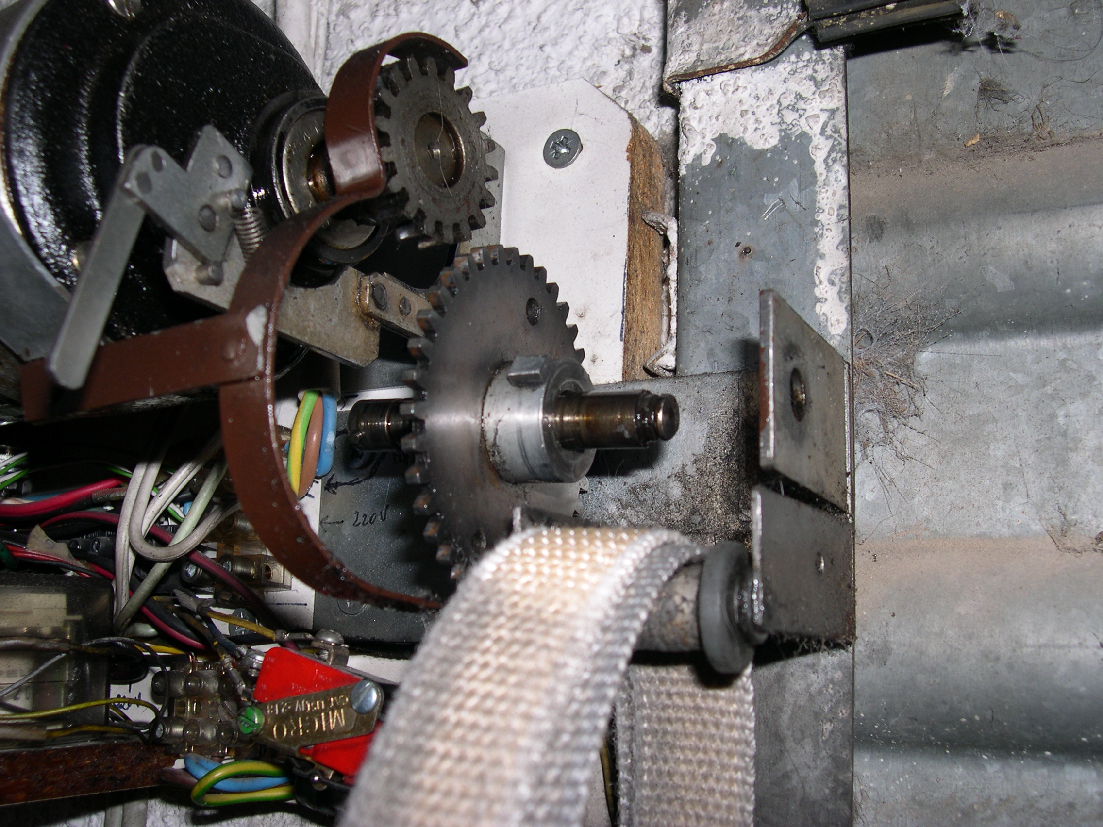 El motor es de una máquina de contabilidad NCR, desechada, tiene una potente reductora que transmite su fuerza mediante engranes dentados, protegidos, que se pueden desacoplar para liberar el cierre. Todo el conjunto está gobernado por unos contactores desechados de otra máquina de contabilidad, relés y contactos electromagnéticos caseros montados en piezas de madera y alimentados por fuentes hechas con transformadores, puentes de diodos y condensadores. Para evitar el arranque en carga, el rodillo de arrastre recibe la fuerza del motor, cuando este ha dado media vuelta para cambiar el sentido de giro, arrastrando la cinta de persiana, tensada con un muelle que está sujeta firmemente a la parte baja del cierre con un mecanismo dotado de resbalón. Por la disposición del muelle que tensa la cinta, si la puerta baja y se encuentra con un obstáculo, el muelle se estira y alarga la cinta que patina sobre el rodillo de arrastre. Al subir, el muelle se contrae mas con el esfuerzo y tensa la cinta evitándose así que patine. El elevador se activa con un mando a distancia desde el exterior y también mediante un teclado con clave cifrada hecho con las teclas de una calculadora, que manda sus pulsaciones a una centralita CASERA, que activa relés en serie hasta completar la clave que da mas de 50.000 combinaciones, siendo modificable la clave mediante el cambio de postura del enchufe de los cables, como si fuera una centralita telefónica con operador, antigua. No se fotografía el interior de la Centralita, que es una caja de chapa de zinc que se aprecia en una de las fotos, para no desvelar su secreto. El conjunta lleva funcionando a diario mas de 15 años sin problemas, tan solo ha habido que reponer la cinta de persiana y la goma que recubre el rodillo de arrastre.