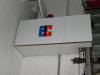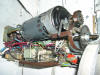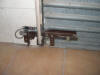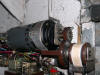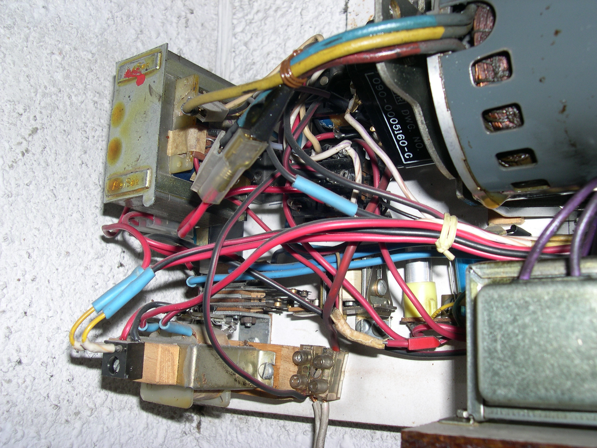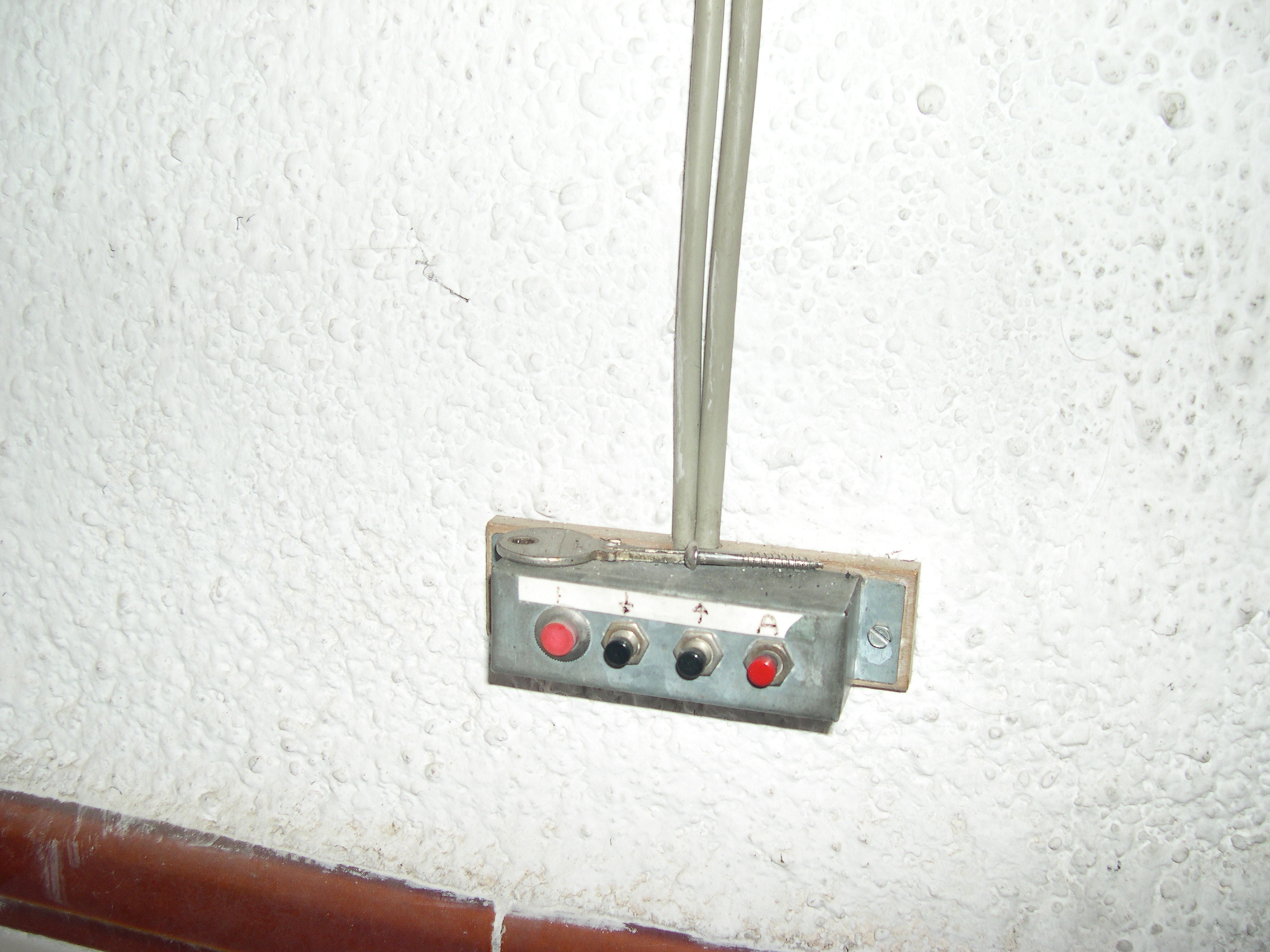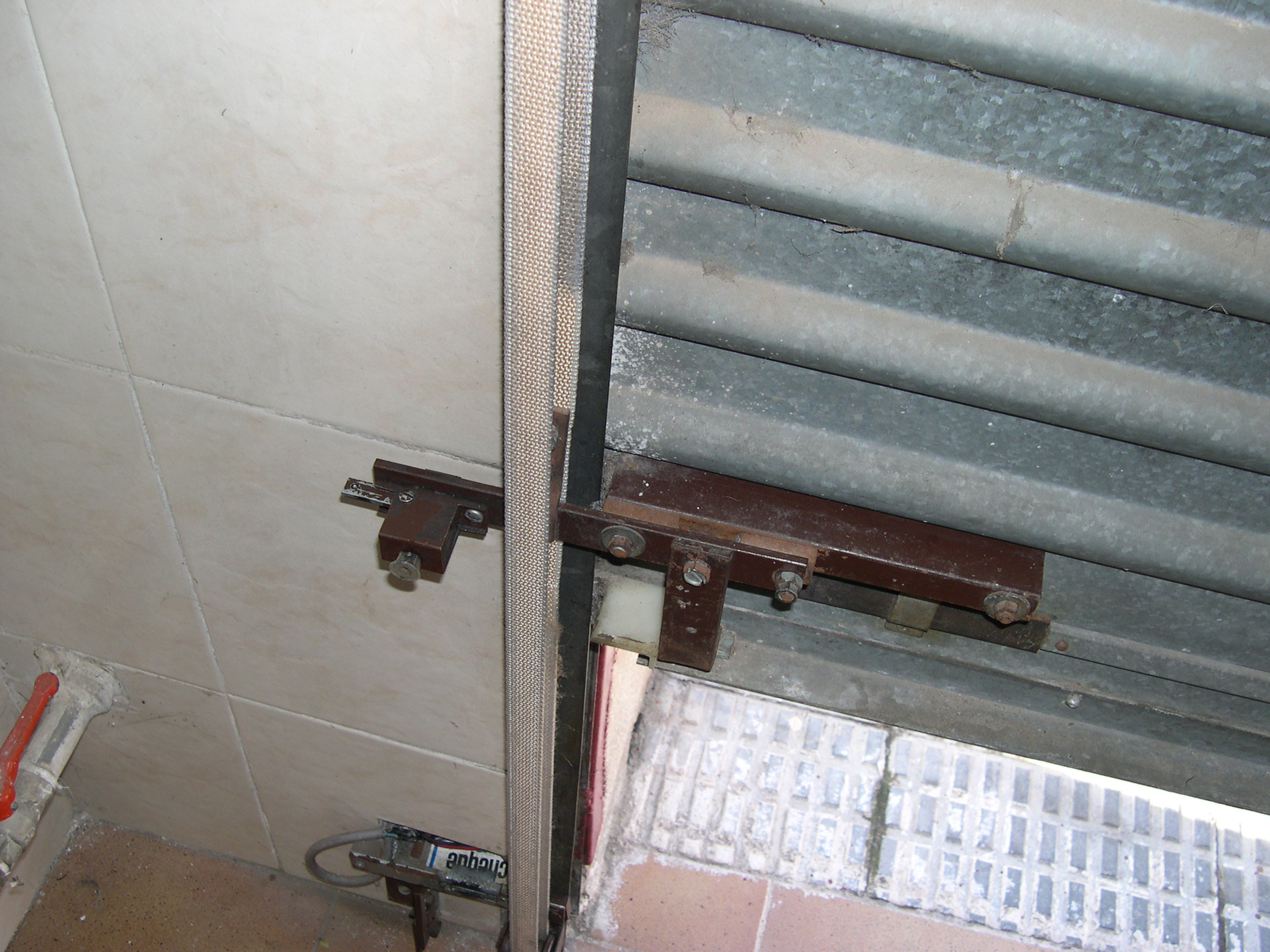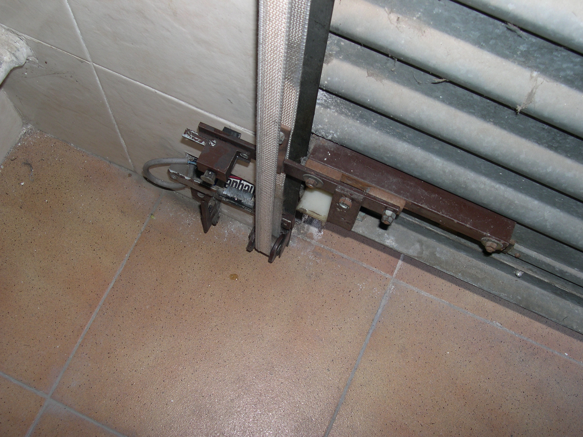 El motor es de una máquina de contabilidad NCR, desechada, tiene una potente reductora que transmite su fuerza mediante engranes dentados, protegidos, que se pueden desacoplar para liberar el cierre. Todo el conjunto está gobernado por unos contactores desechados de otra máquina de contabilidad, relés y contactos electromagnéticos caseros montados en piezas de madera y alimentados por fuentes hechas con transformadores, puentes de diodos y condensadores. Para evitar el arranque en carga, el rodillo de arrastre recibe la fuerza del motor, cuando este ha dado media vuelta para cambiar el sentido de giro, arrastrando la cinta de persiana, tensada con un muelle que está sujeta firmemente a la parte baja del cierre con un mecanismo dotado de resbalón. Por la disposición del muelle que tensa la cinta, si la puerta baja y se encuentra con un obstáculo, el muelle se estira y alarga la cinta que patina sobre el rodillo de arrastre. Al subir, el muelle se contrae mas con el esfuerzo y tensa la cinta evitándose así que patine. El elevador se activa con un mando a distancia desde el exterior y también mediante un teclado con clave cifrada hecho con las teclas de una calculadora, que manda sus pulsaciones a una centralita CASERA, que activa relés en serie hasta completar la clave que da mas de 50.000 combinaciones, siendo modificable la clave mediante el cambio de postura del enchufe de los cables, como si fuera una centralita telefónica con operador, antigua. No se fotografía el interior de la Centralita, que es una caja de chapa de zinc que se aprecia en una de las fotos, para no desvelar su secreto. El conjunta lleva funcionando a diario mas de 15 años sin problemas, tan solo ha habido que reponer la cinta de persiana y la goma que recubre el rodillo de arrastre.