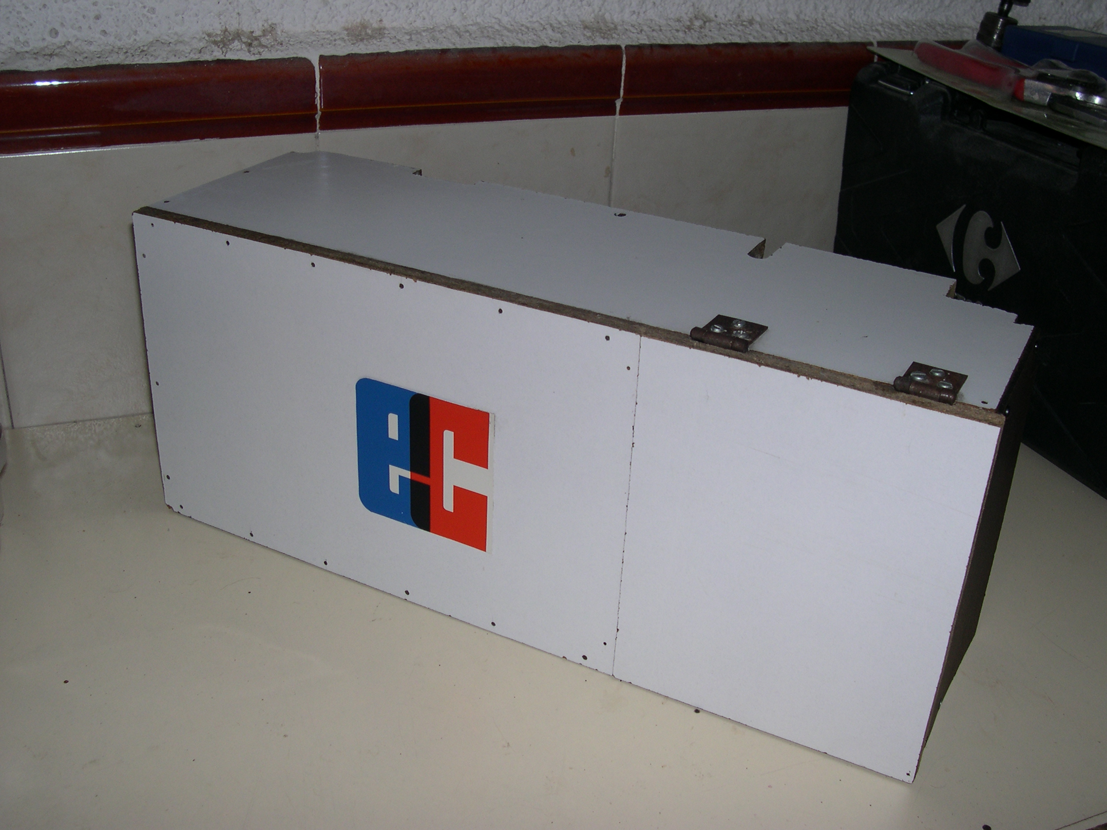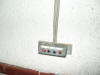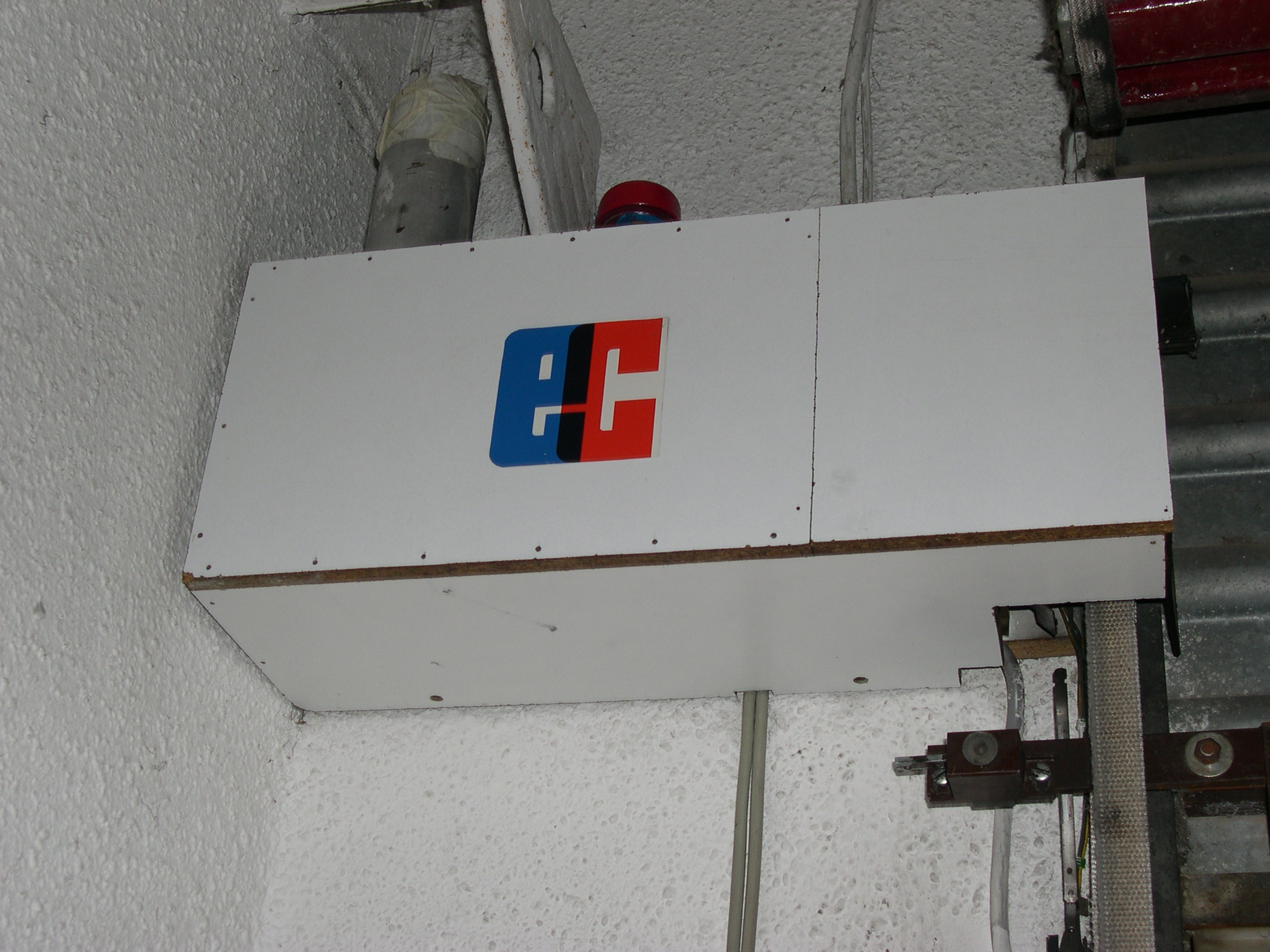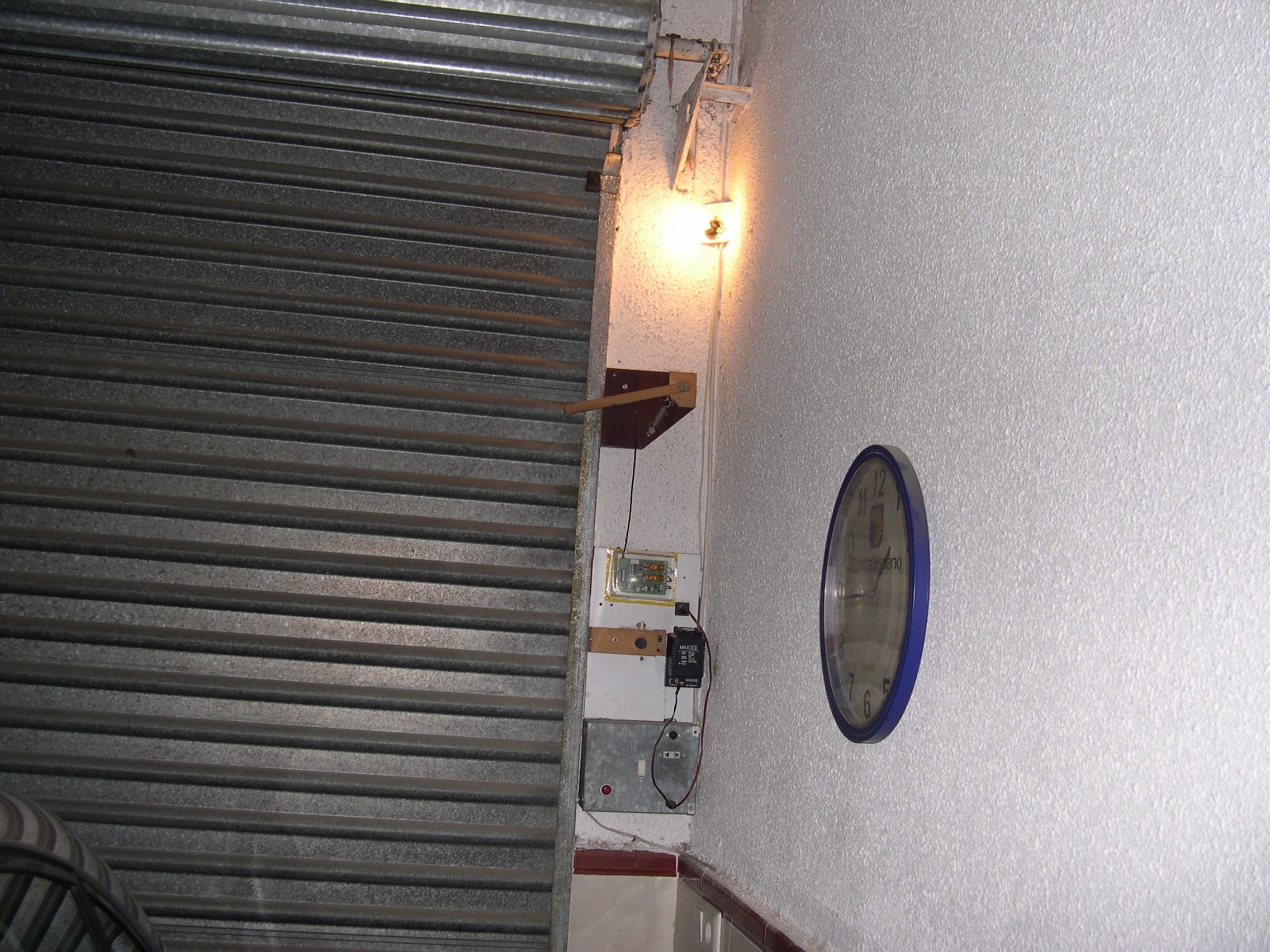 Elevador automático de puerta de garaje con cierre enrollable. Dispositivo fijado en un tablero de aglomerado chapado, asido a la pared con tacos y tornillos y al marco metálico del cierre. Funciona básicamente con una cinta de persiana, rodillos de madera con cojinetes de nailon, un motor con reductora y un cierre de portero automático normal, modificado.