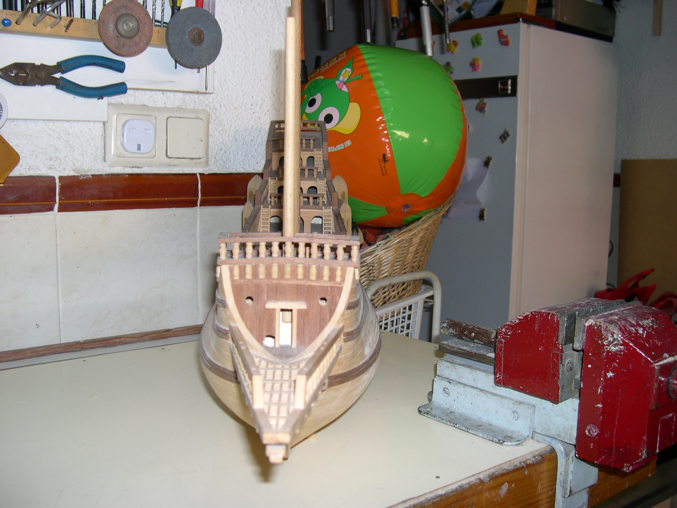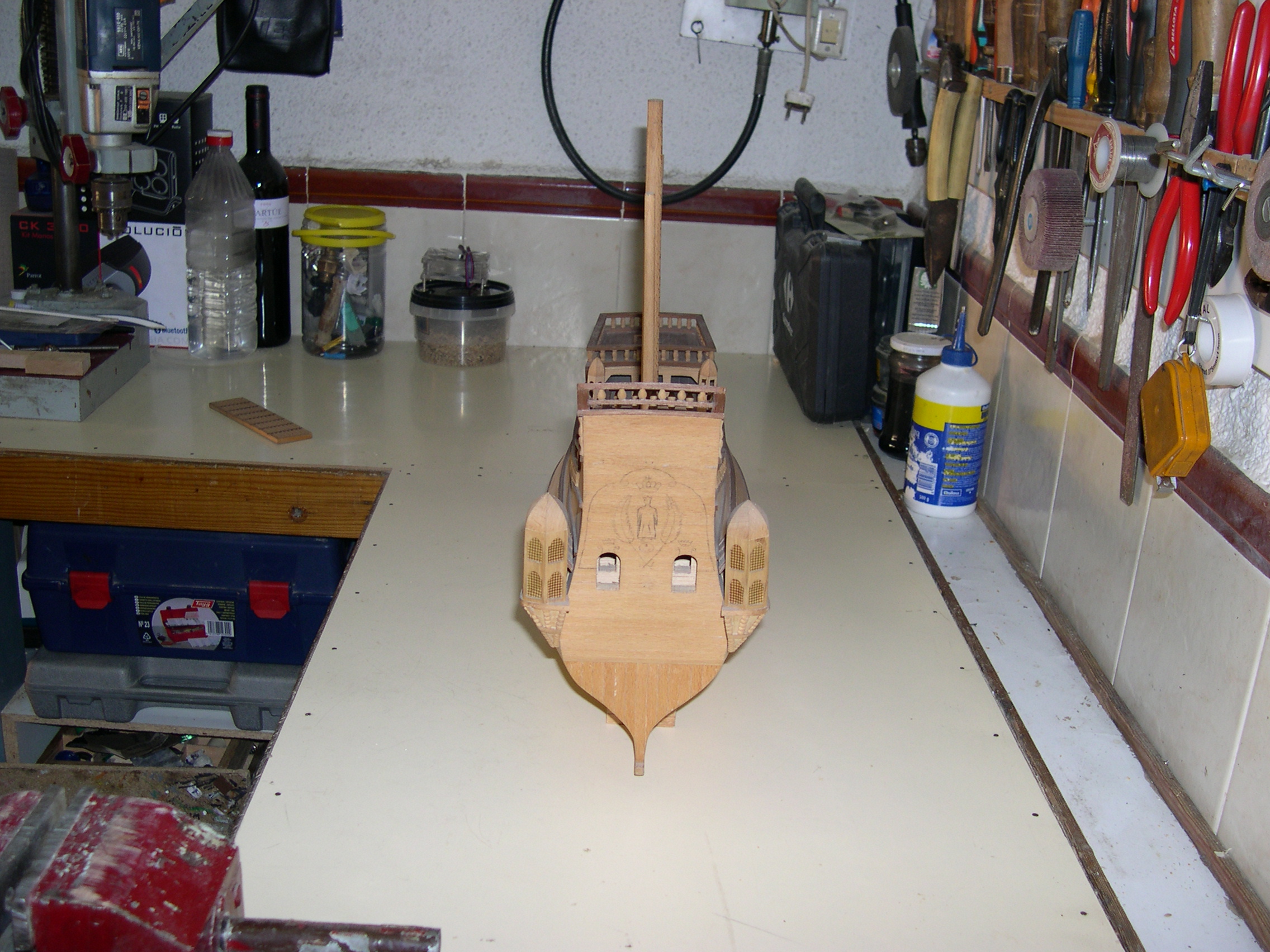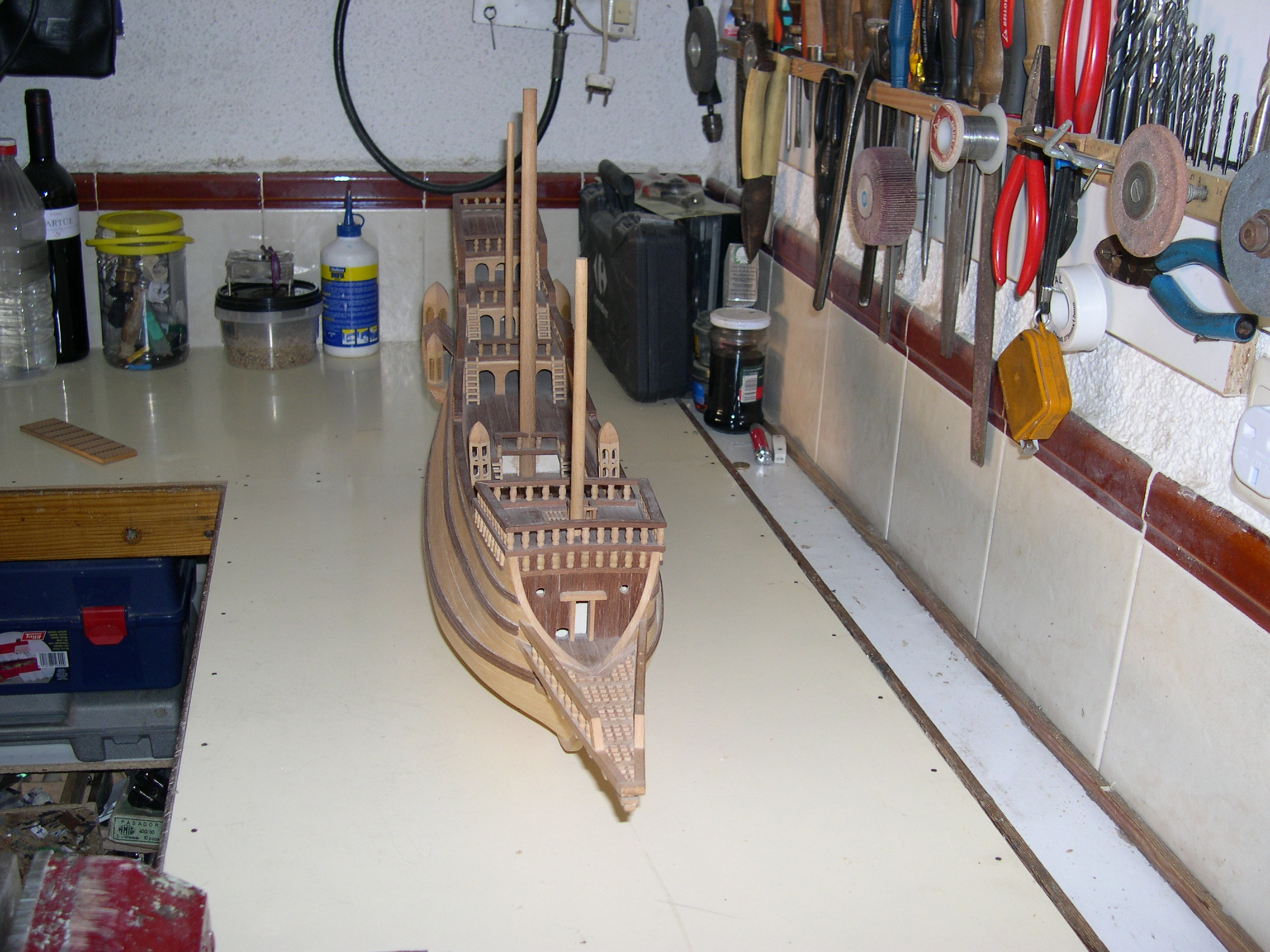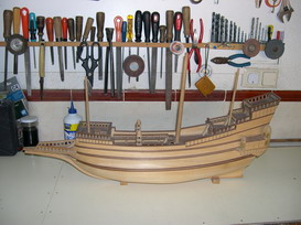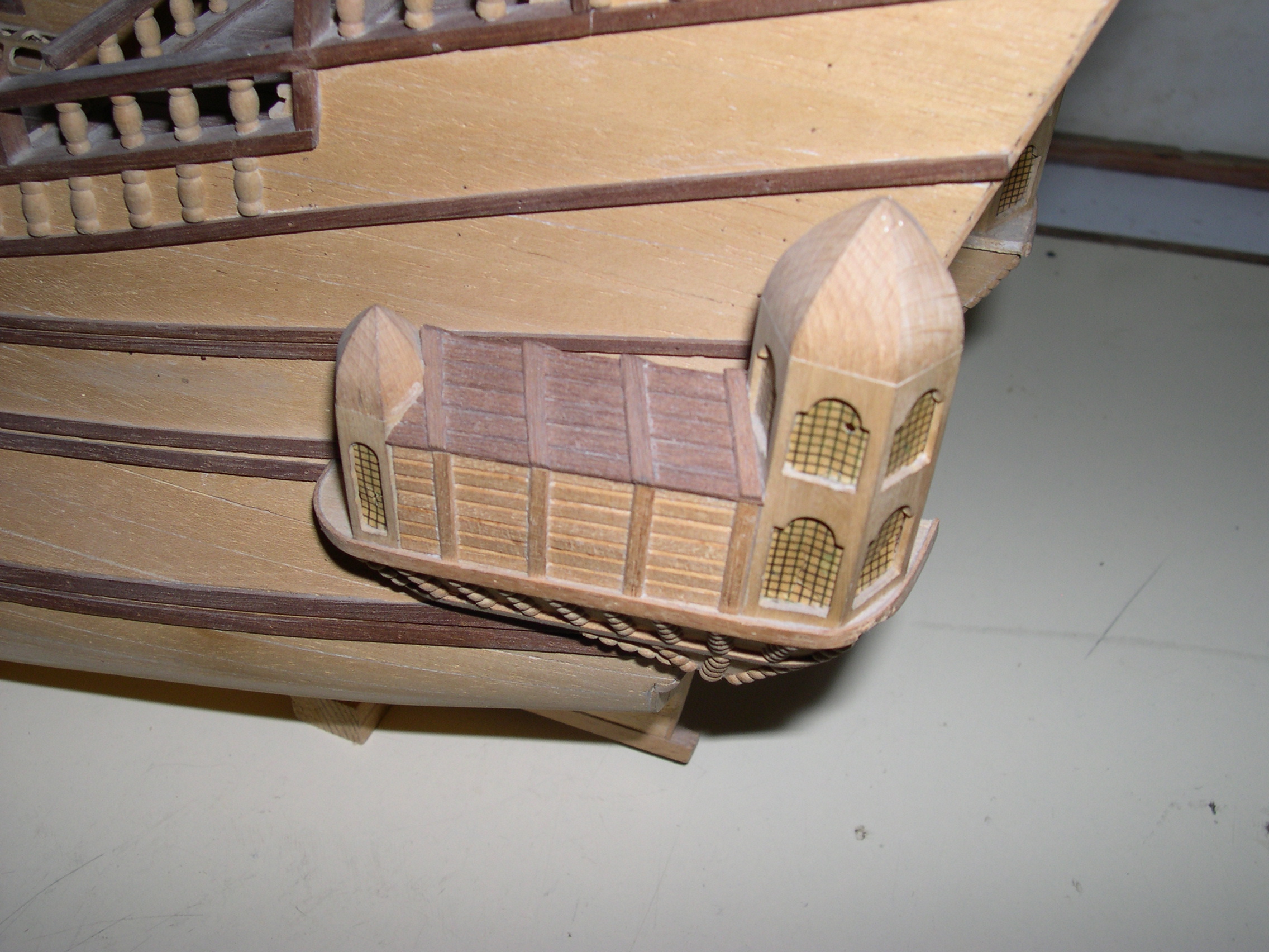 Maqueta construida, bajo planos a escala 3 veces superior, faltan todas las cañoneras, botes salvavidas, velamen, timón, cordado etc. No se han utilizado piezas prefabricadas, todos y cada uno los elementos de la maqueta están cortados de bloques de distintos tipos de madera, en tablas, recortes y otros trozos de tamaño manejable, incluidas las finas tablas del casco así como todos y cada uno de los balaustres y adornos torneados.