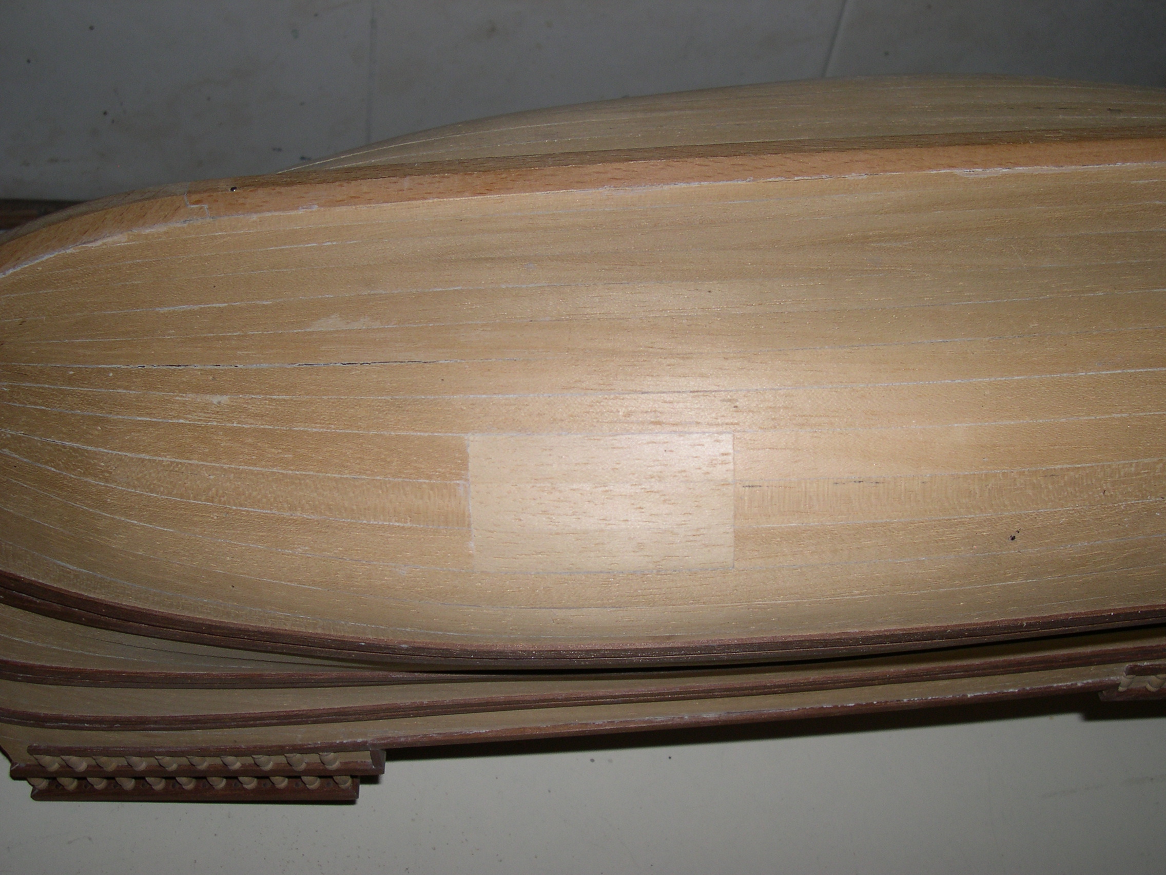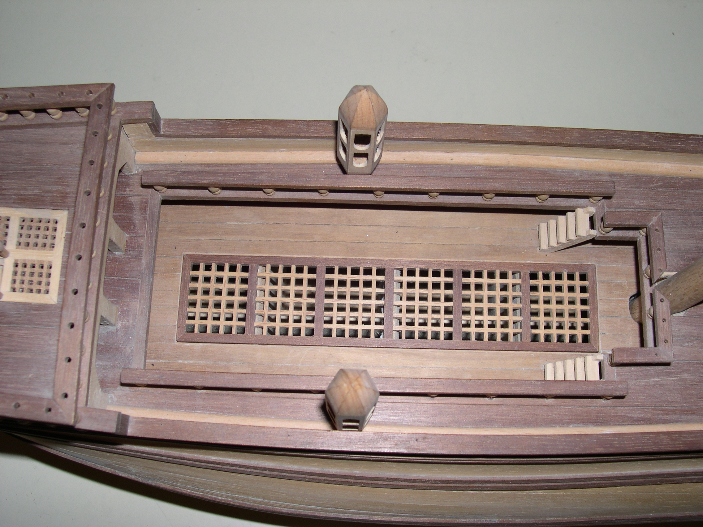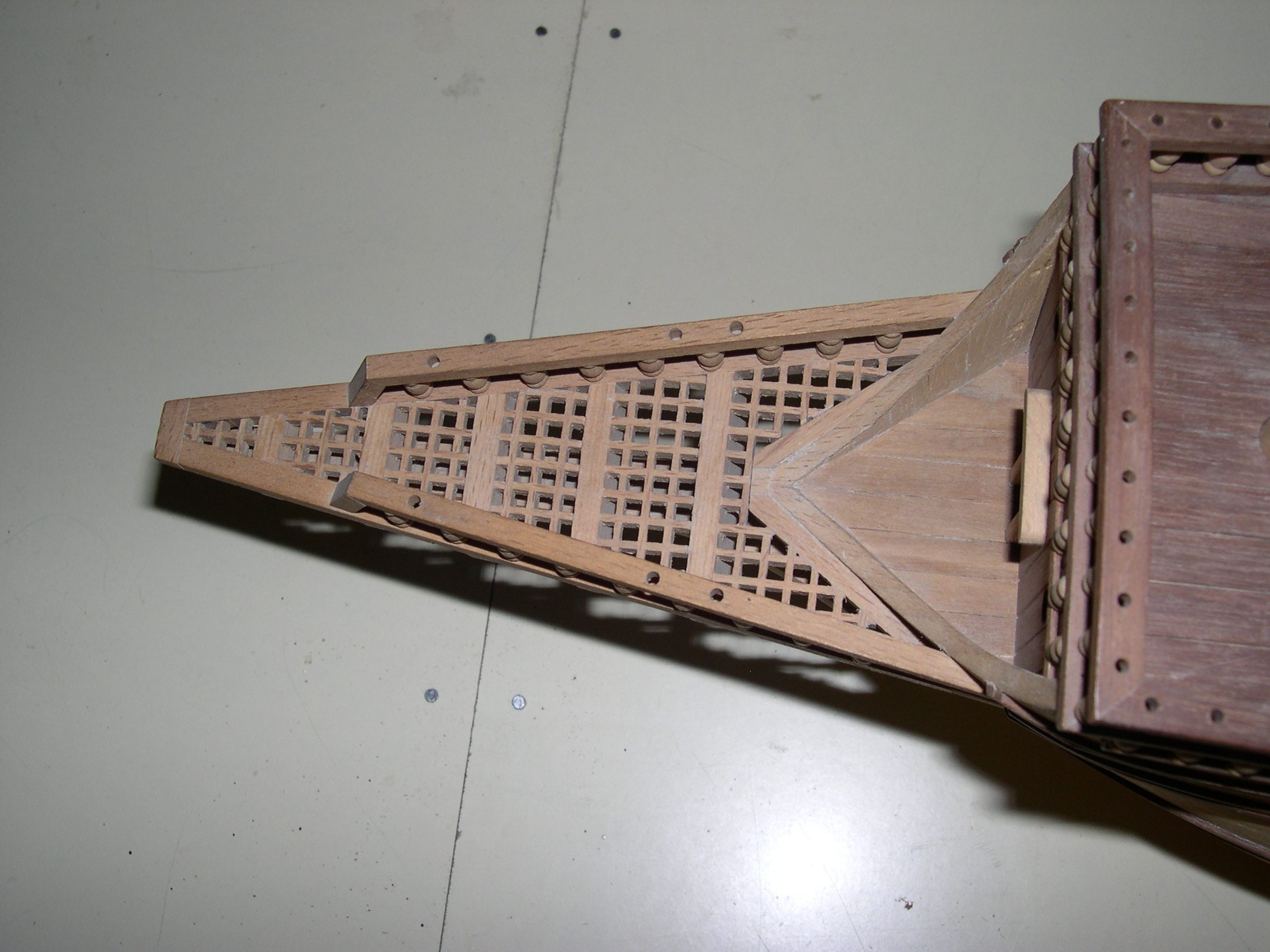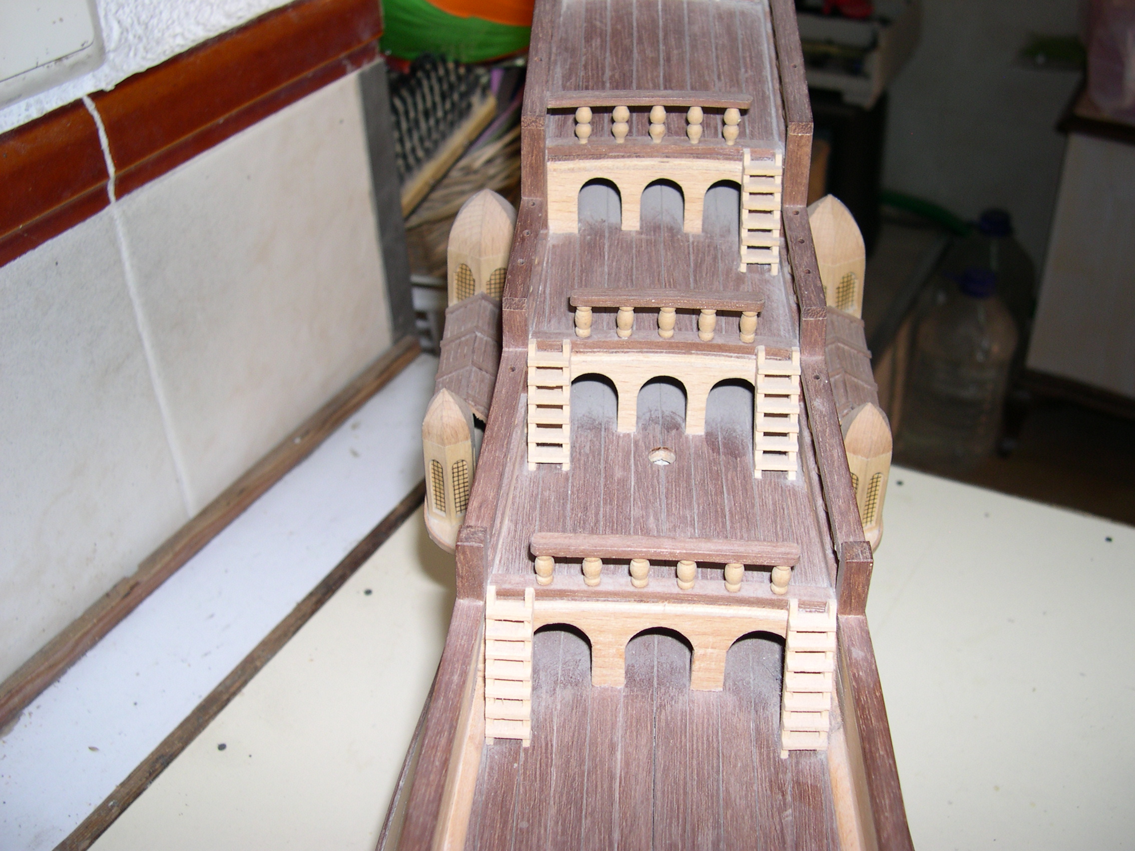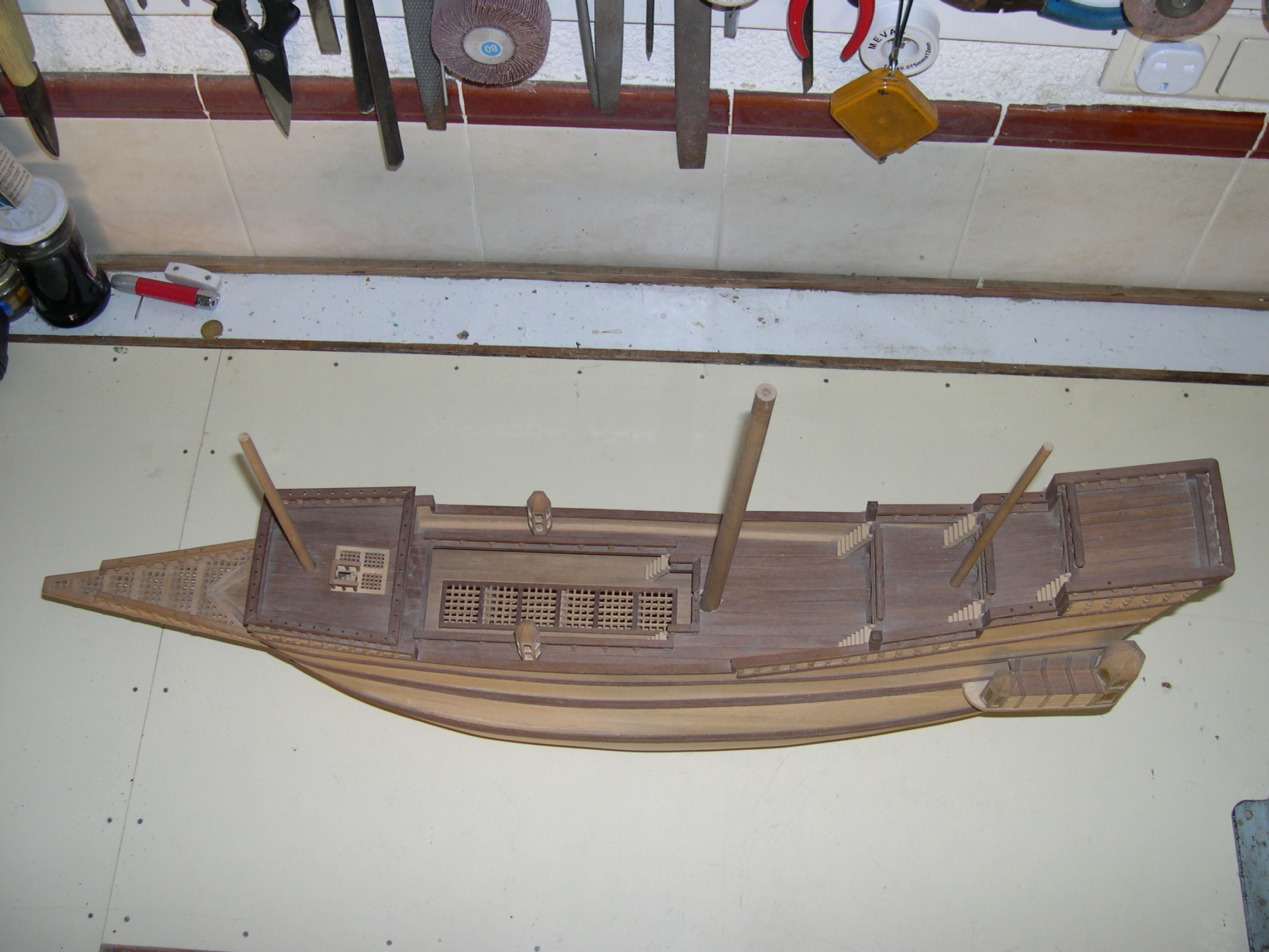 Maqueta construida, bajo planos a escala 3 veces superior, faltan todas las cañoneras, botes salvavidas, velamen, timón, cordado etc. No se han utilizado piezas prefabricadas, todos y cada uno los elementos de la maqueta están cortados de bloques de distintos tipos de madera, en tablas, recortes y otros trozos de tamaño manejable, incluidas las finas tablas del casco así como todos y cada uno de los balaustres y adornos torneados.