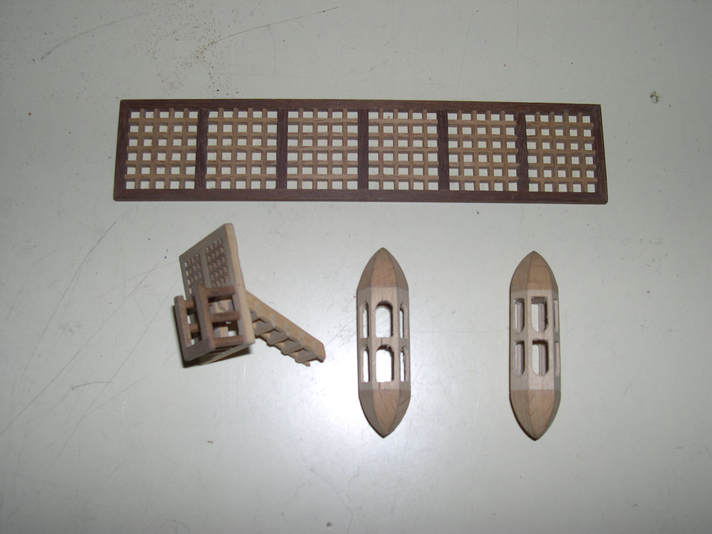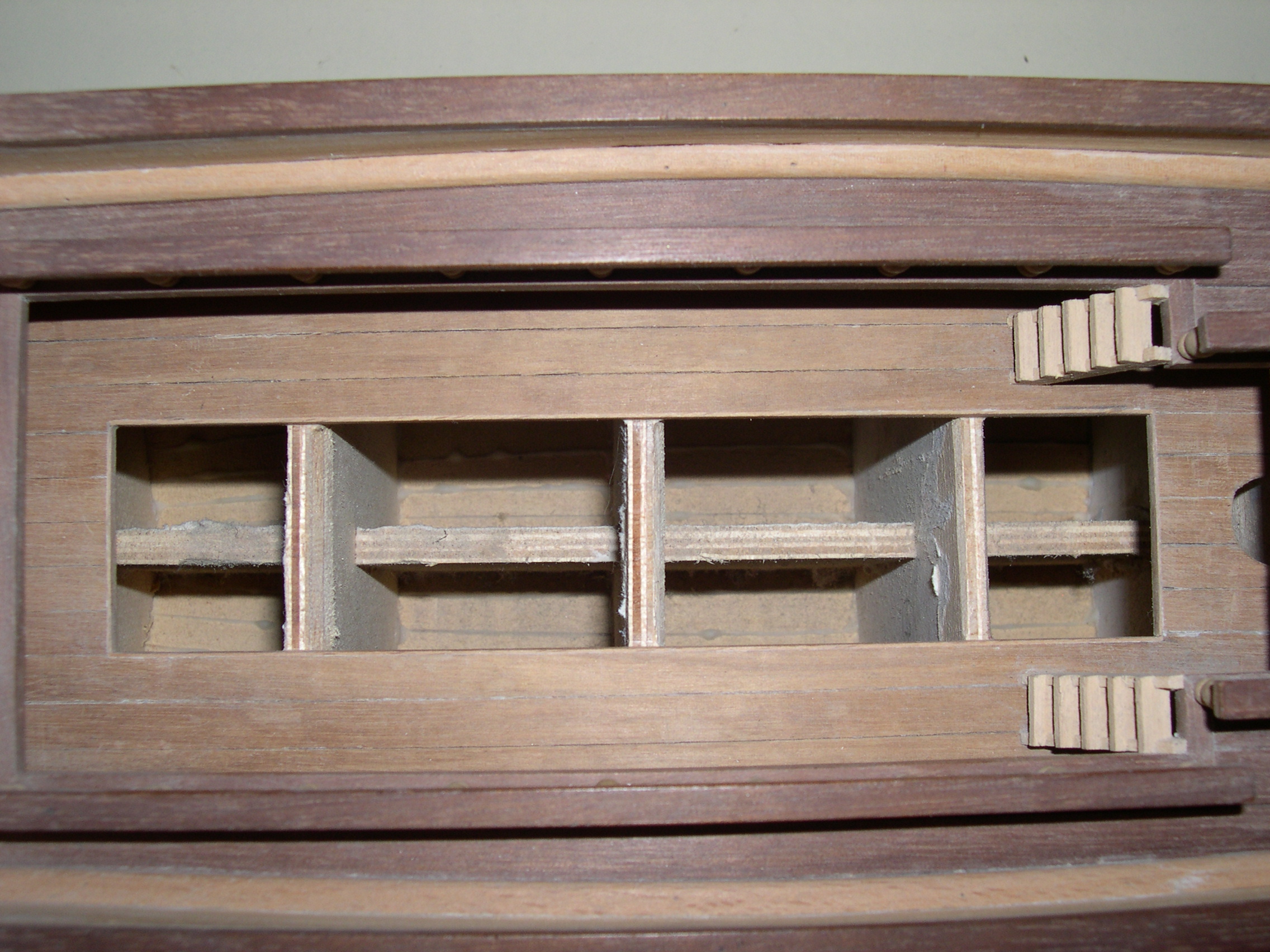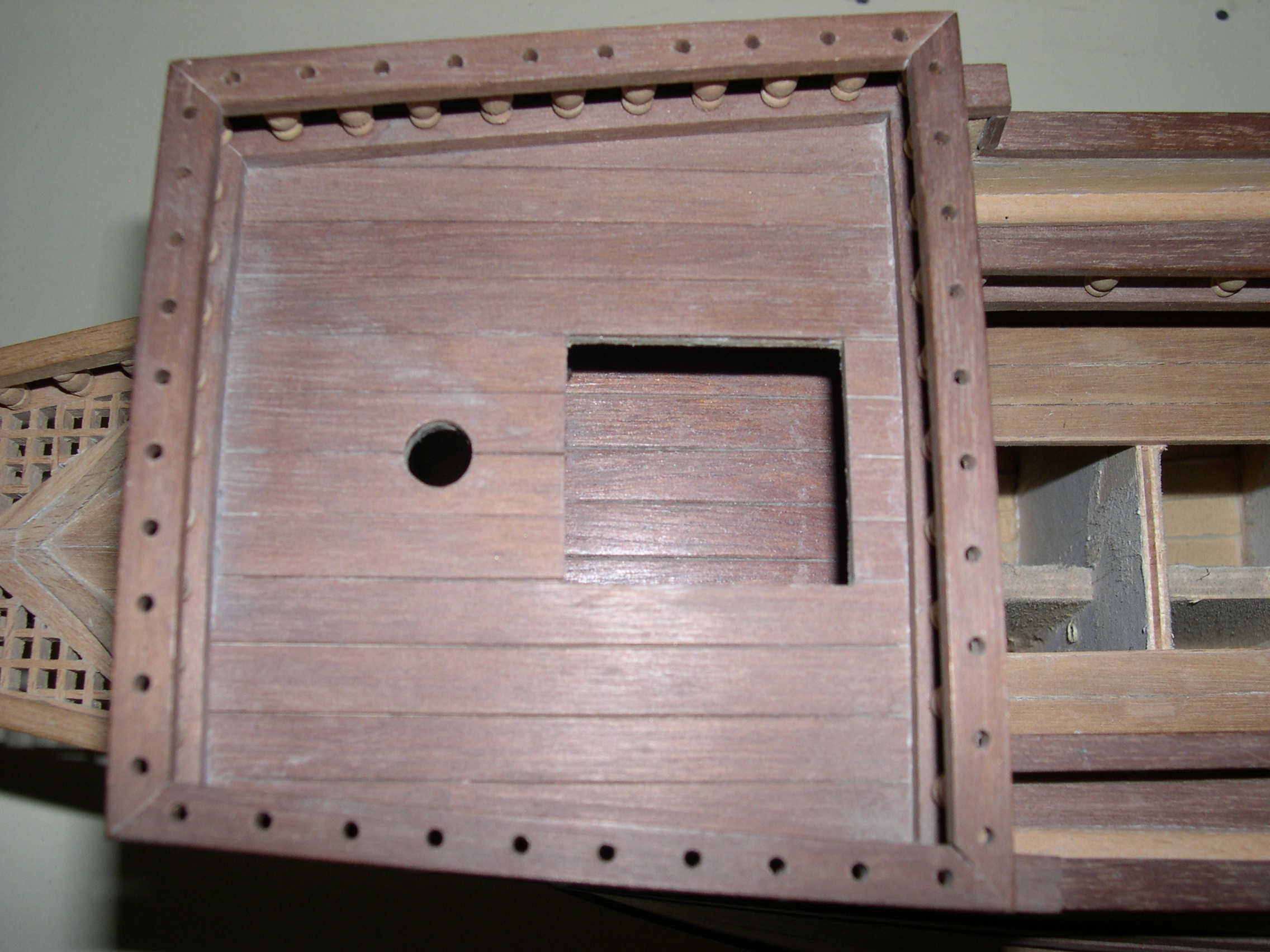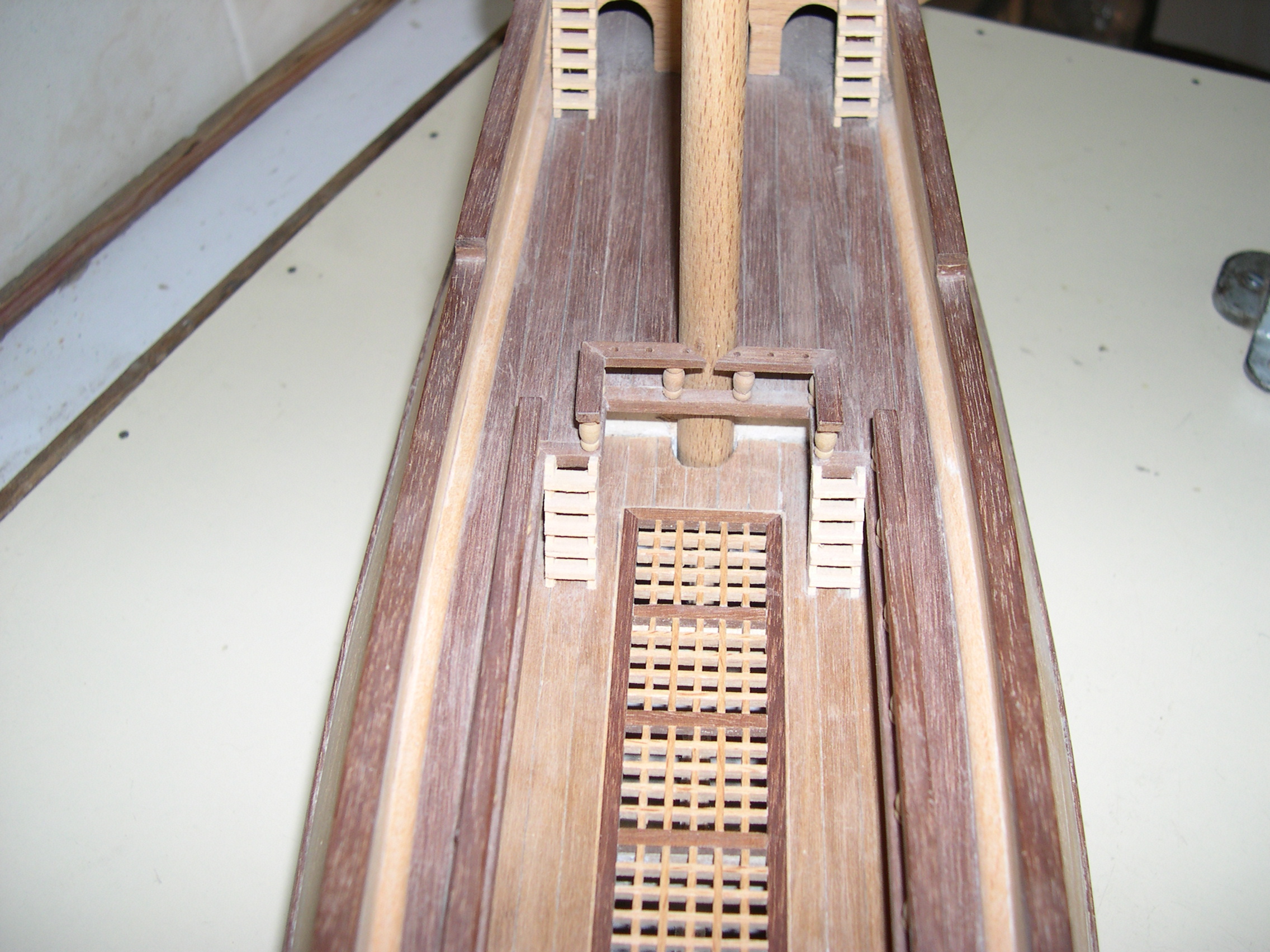 Maqueta construida, bajo planos a escala 3 veces superior, faltan todas las cañoneras, botes salvavidas, velamen, timón, cordado etc. No se han utilizado piezas prefabricadas, todos y cada uno los elementos de la maqueta están cortados de bloques de distintos tipos de madera, en tablas, recortes y otros trozos de tamaño manejable, incluidas las finas tablas del casco así como todos y cada uno de los balaustres y adornos torneados.