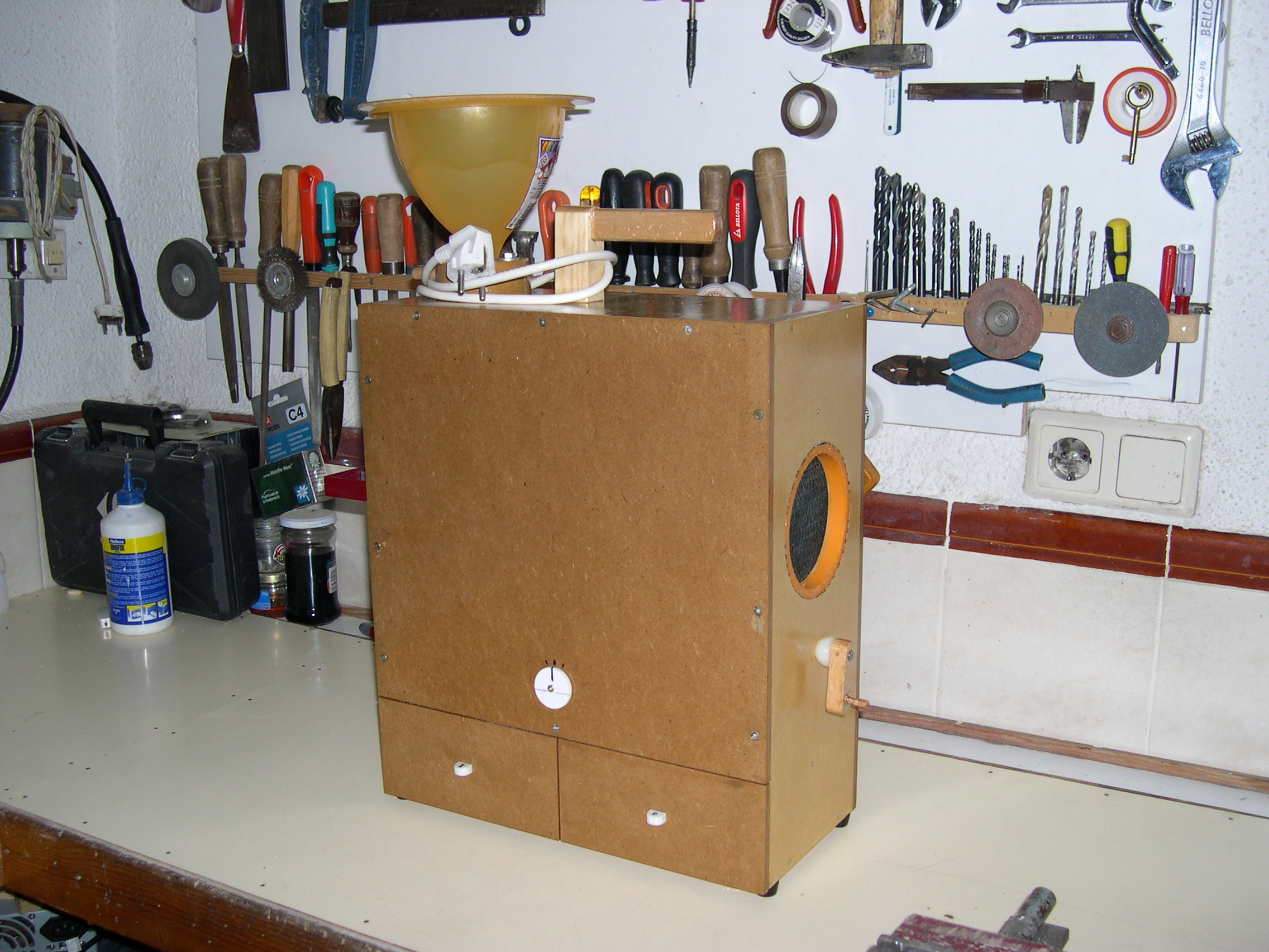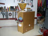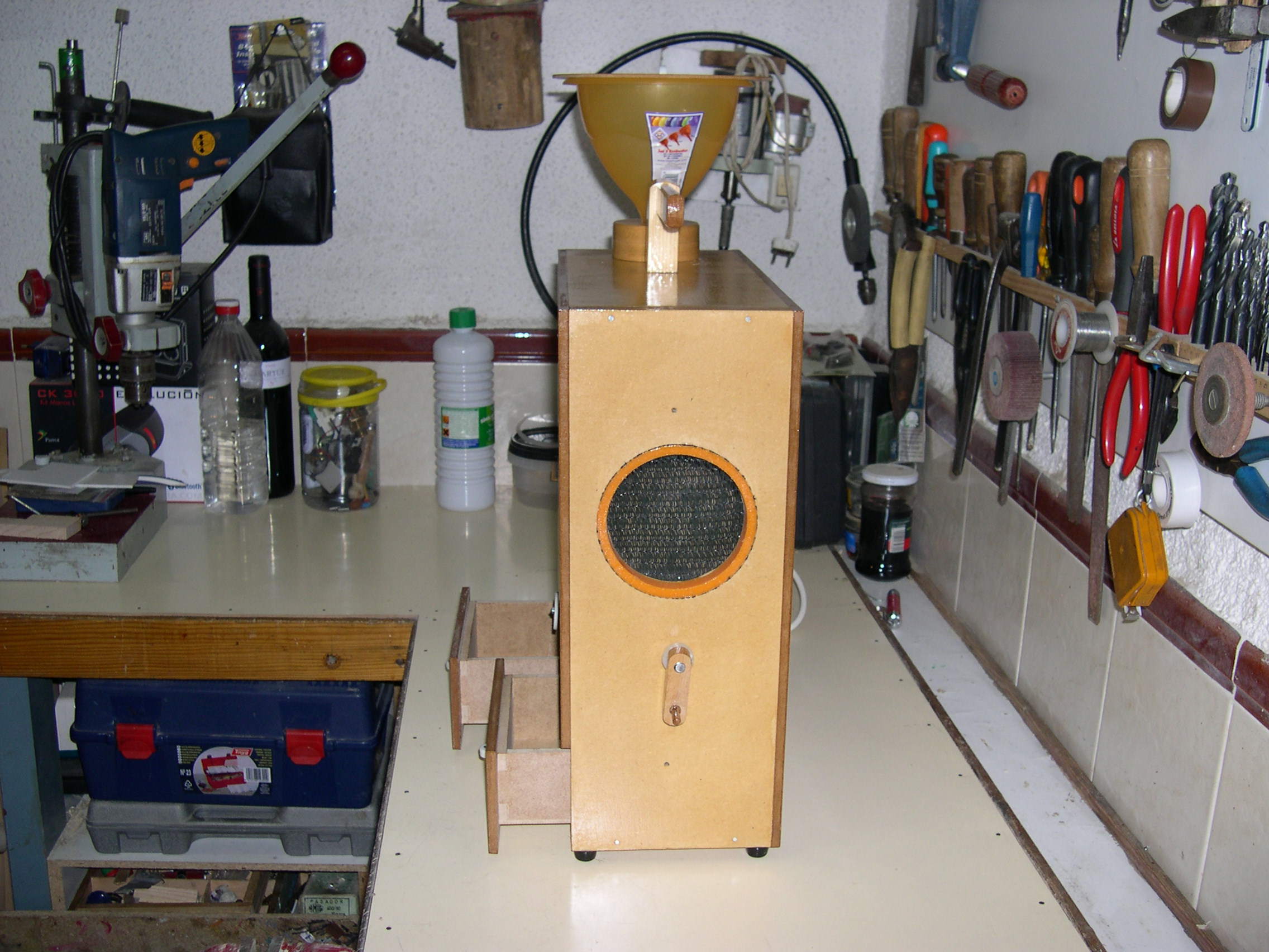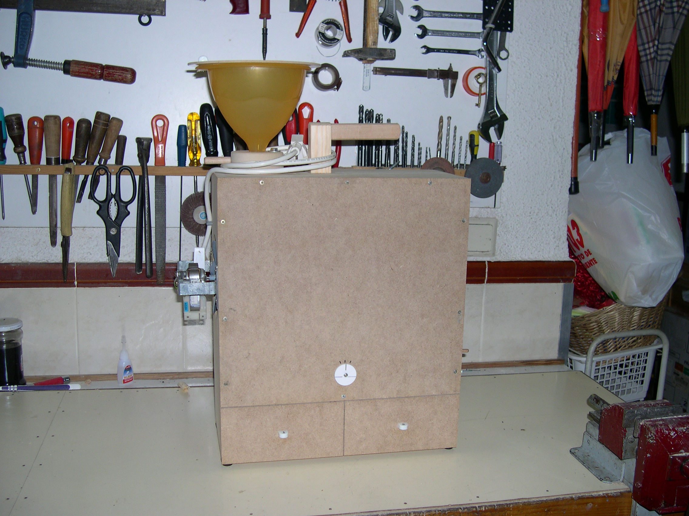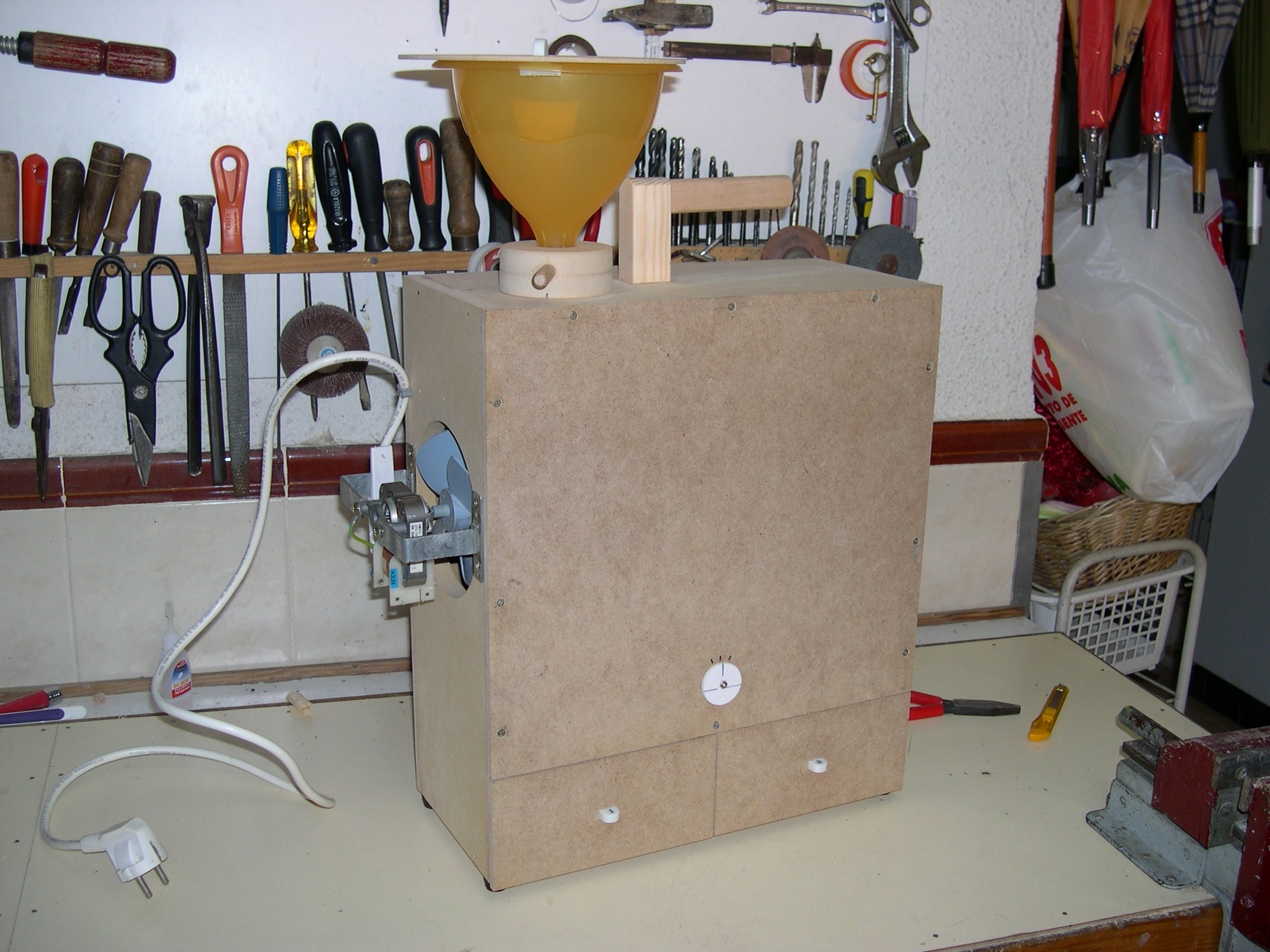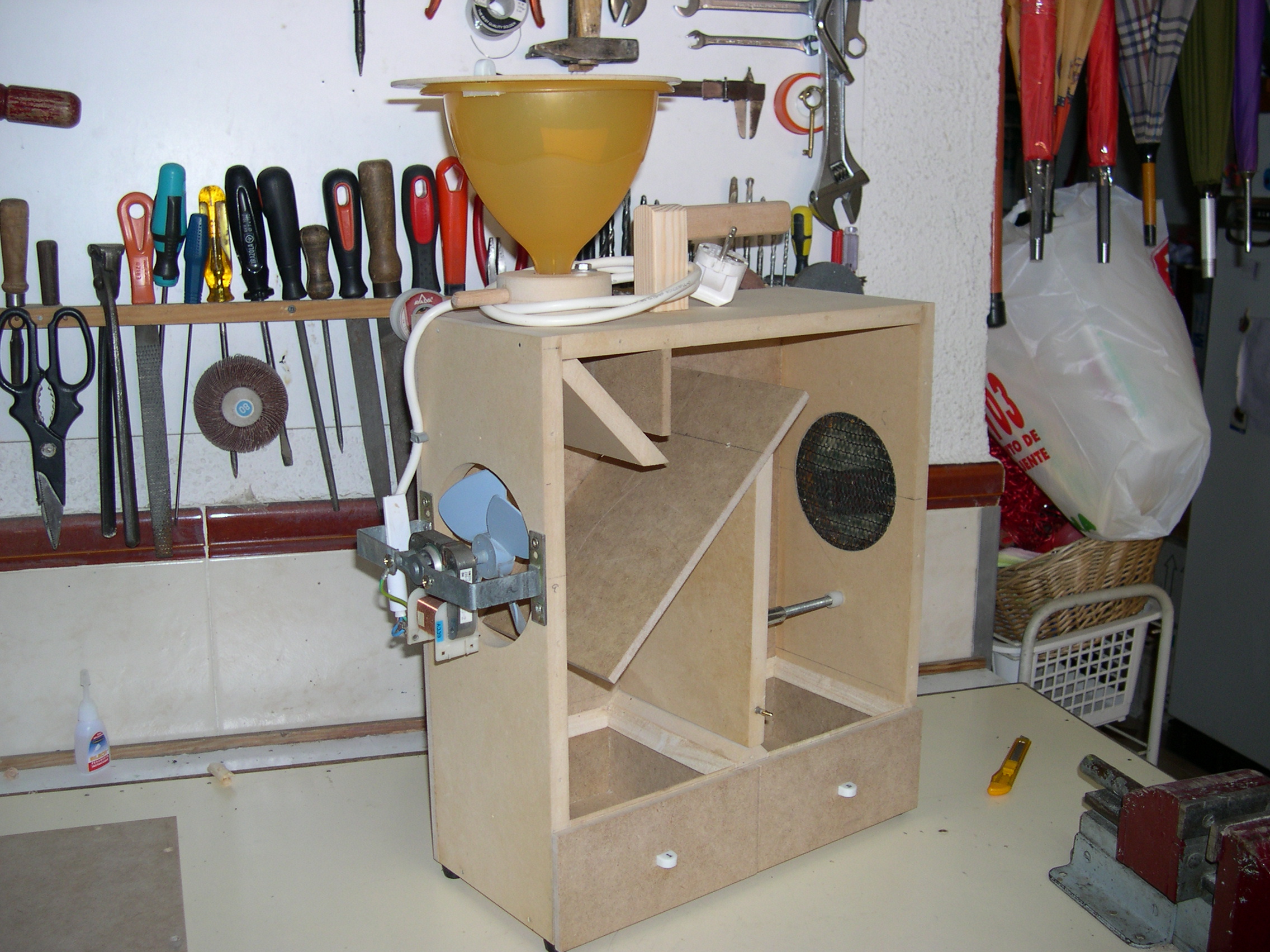 Construido con tableros de TP 15 mm. y 6 mm. Medidas externas 40 cms. de alto X 35 cms. de ancho X 16 cms. de profundidad. Regulador de entrada del grano de la tolva (en la posición central cae libremente el grano sucio y desplazando la palanca hacia los lados se va cerrando el orificio de caída hasta quedar totalmente bloqueado, impidiendo la bajada del grano) . Regulador de inclinación de la rampa de limpieza (para adaptar la máquina al tipo de grano). Cajones inferiores, izquierdo para semillas limpias y derecho para cáscaras.