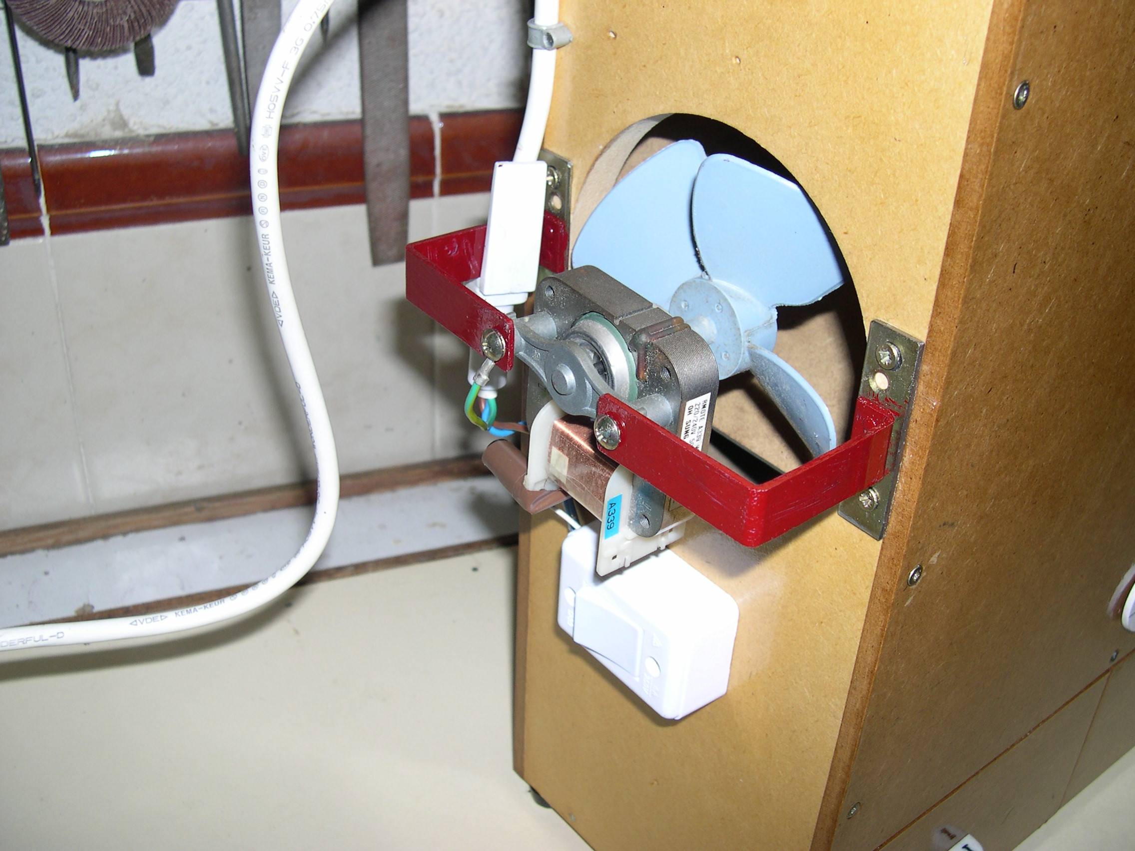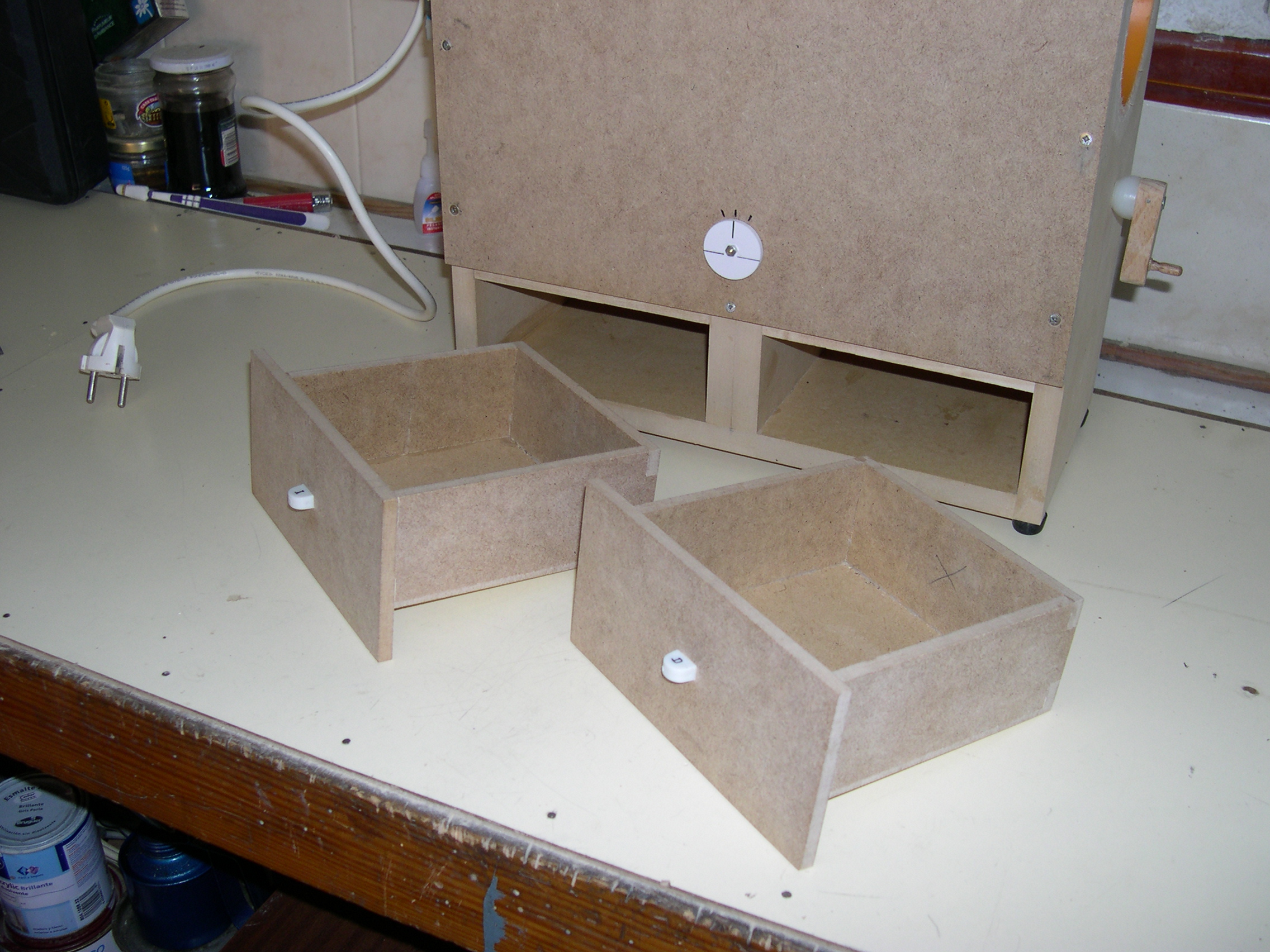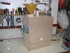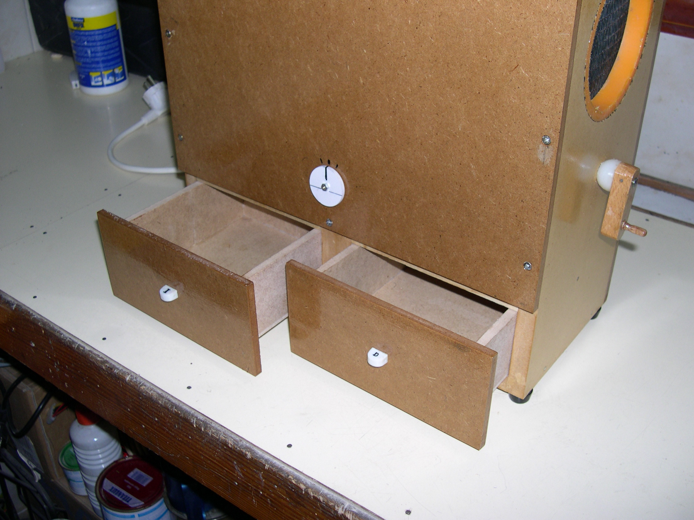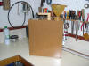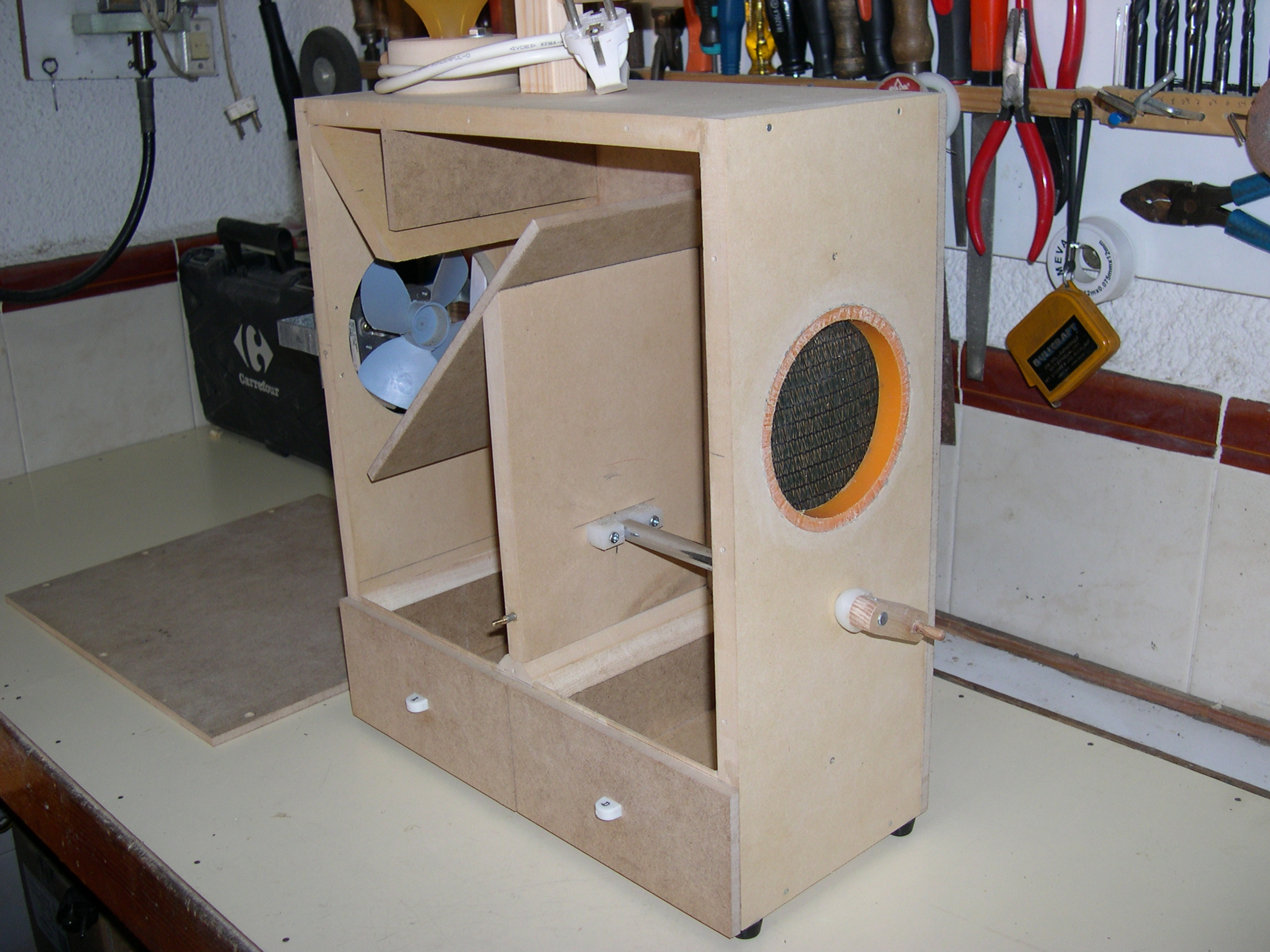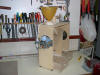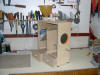 Construido con tableros de TP 15 mm. y 6 mm. Medidas externas 40 cms. de alto X 35 cms. de ancho X 16 cms. de profundidad. Regulador de entrada del grano de la tolva (en la posición central cae libremente el grano sucio y desplazando la palanca hacia los lados se va cerrando el orificio de caída hasta quedar totalmente bloqueado, impidiendo la bajada del grano) . Regulador de inclinación de la rampa de limpieza (para adaptar la máquina al tipo de grano). Cajones inferiores, izquierdo para semillas limpias y derecho para cáscaras.