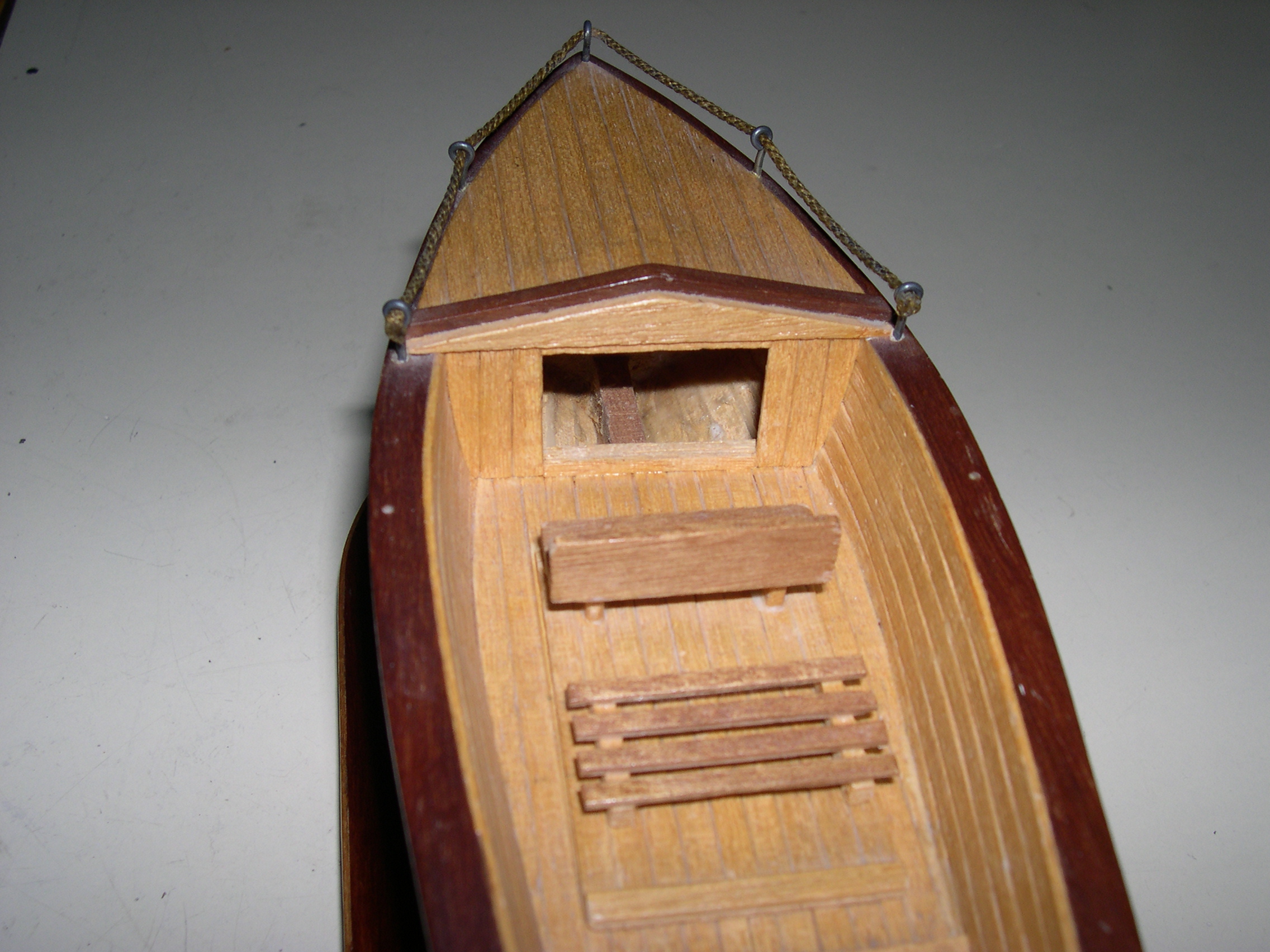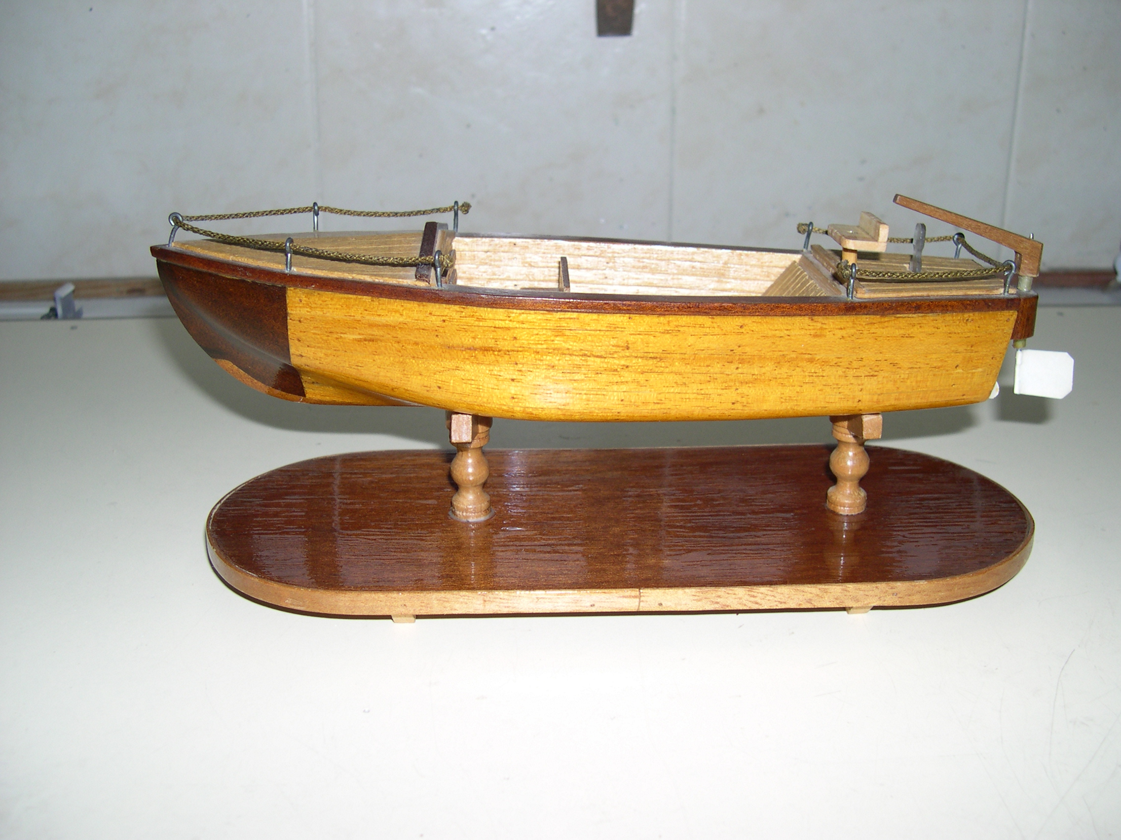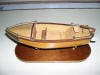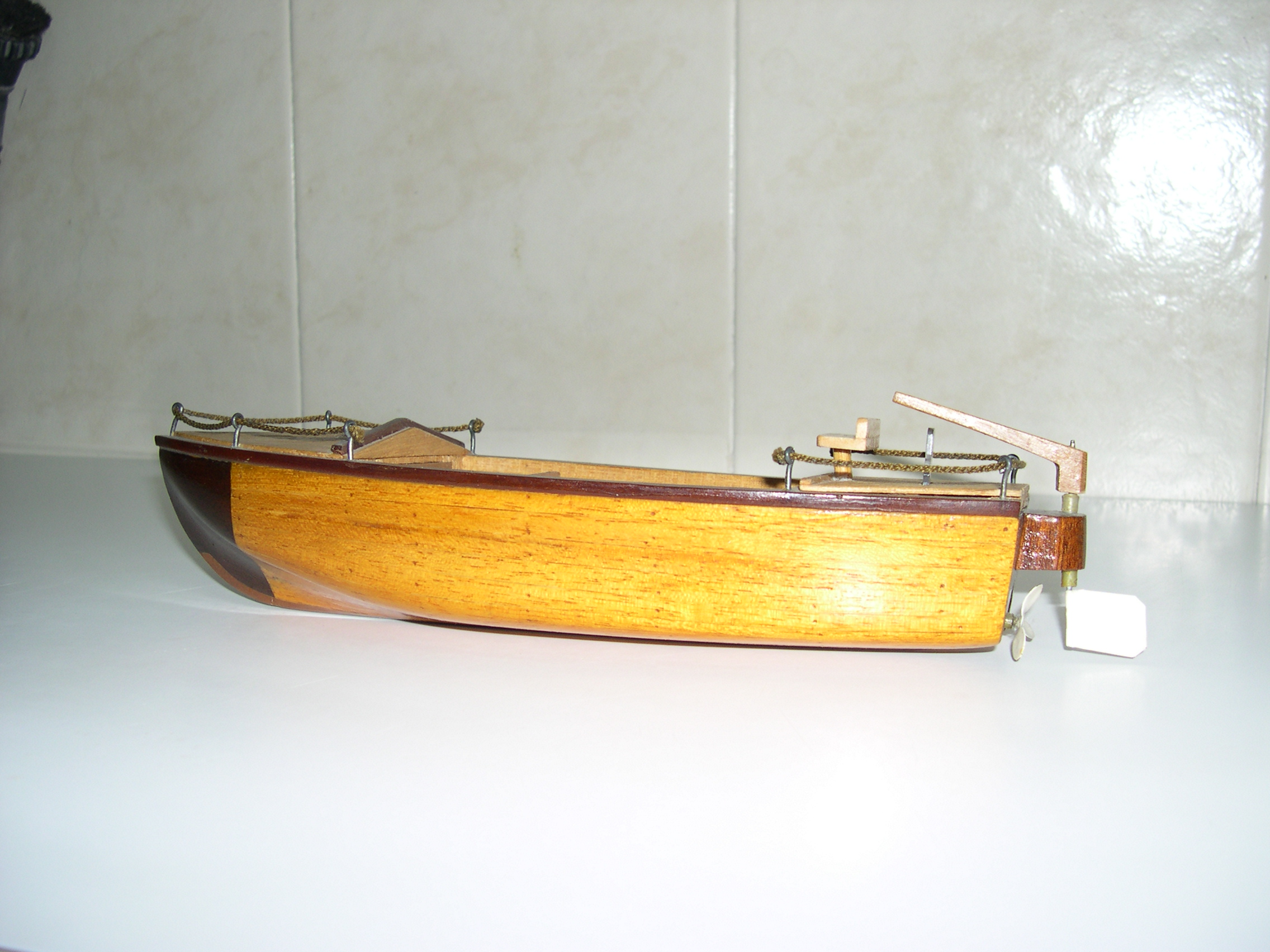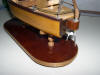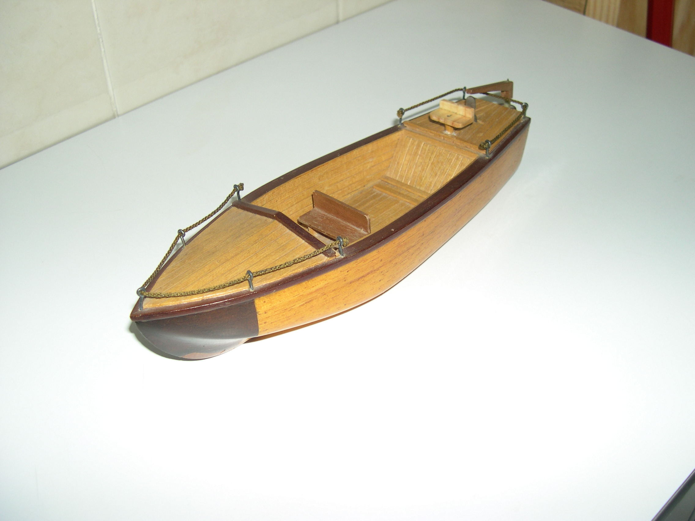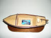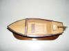 Maqueta de barcaza con motor eléctrico, protegida con barniz especial, que puede navegar sin deteriorase. Construida sin planos, por lo que no guarda parecido con ningún bote real. Toda la maqueta, está hecha con listones encolados, hay que ampliar la foto para ver su unión que está muy ajustada en el casco para evitar entrada de agua.