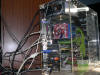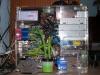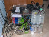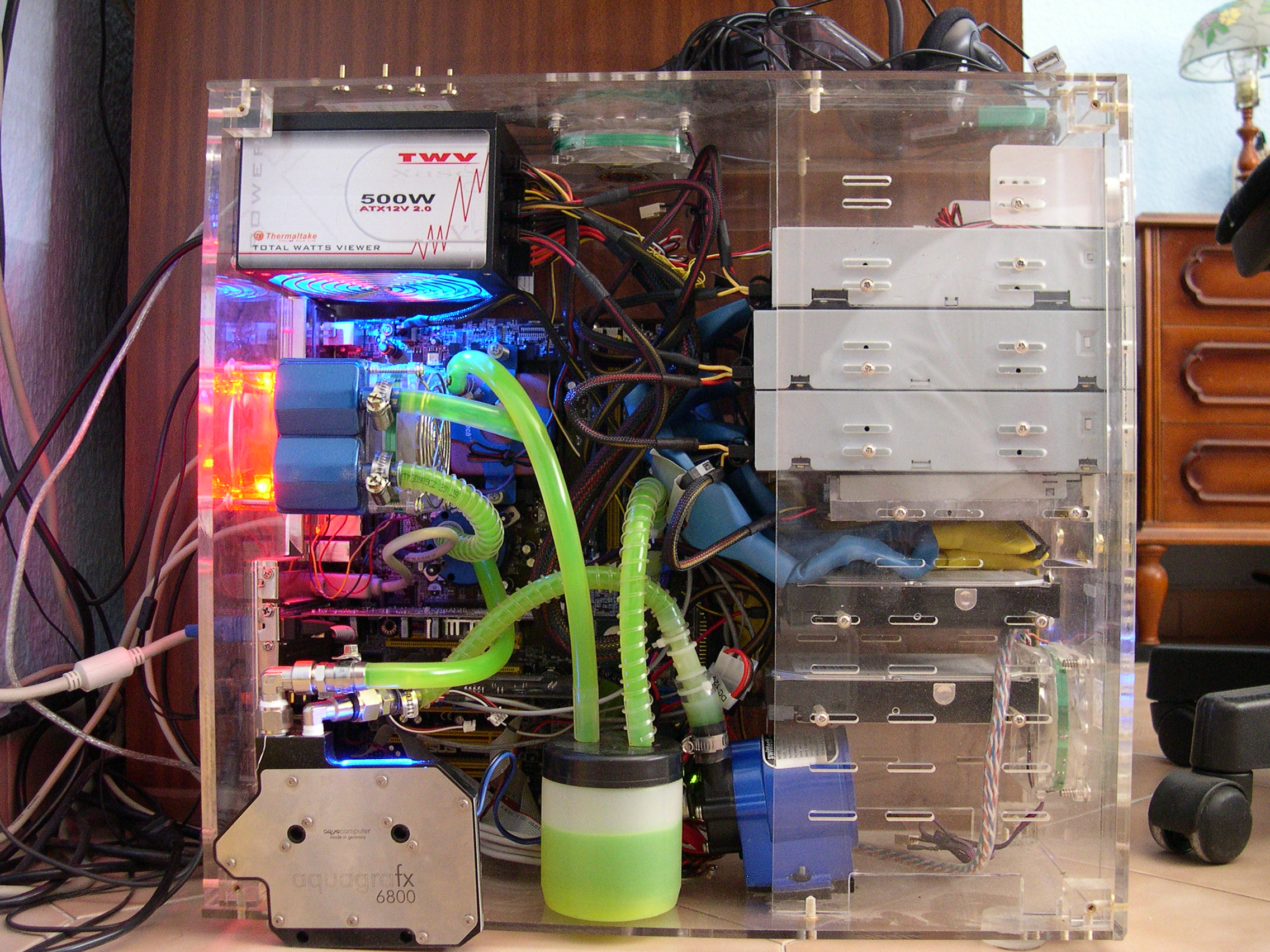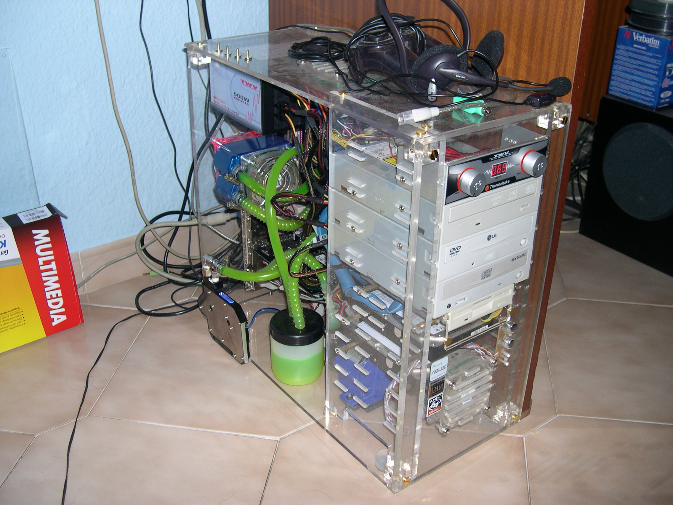 Caja transparente, Athlon 64, 1 Gb ram, dos HD de 160 Gb en Raid, tarjeta sonido con equipo DTS con conexión por cable óptico, tarjeta video Nvidia Gesford 6800 AGP, regulador de velocidad de ventiladores, medidor de consumo y REFRIGERACIÓN POR AGUA.