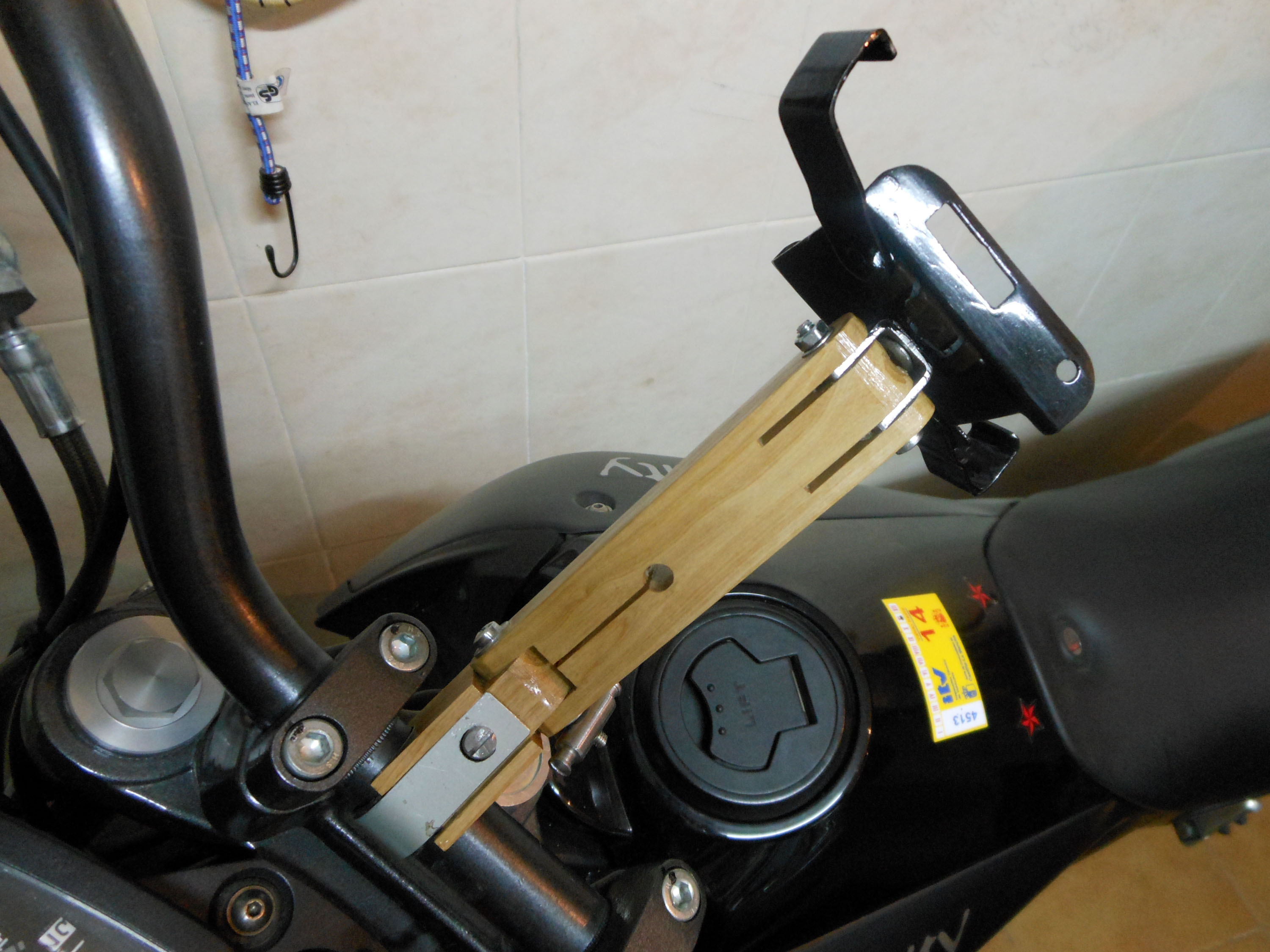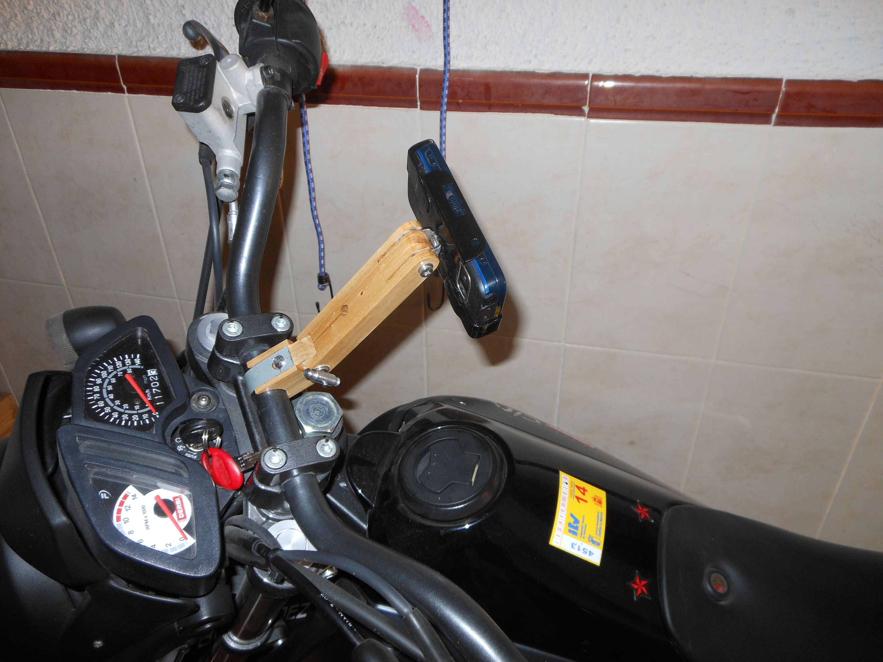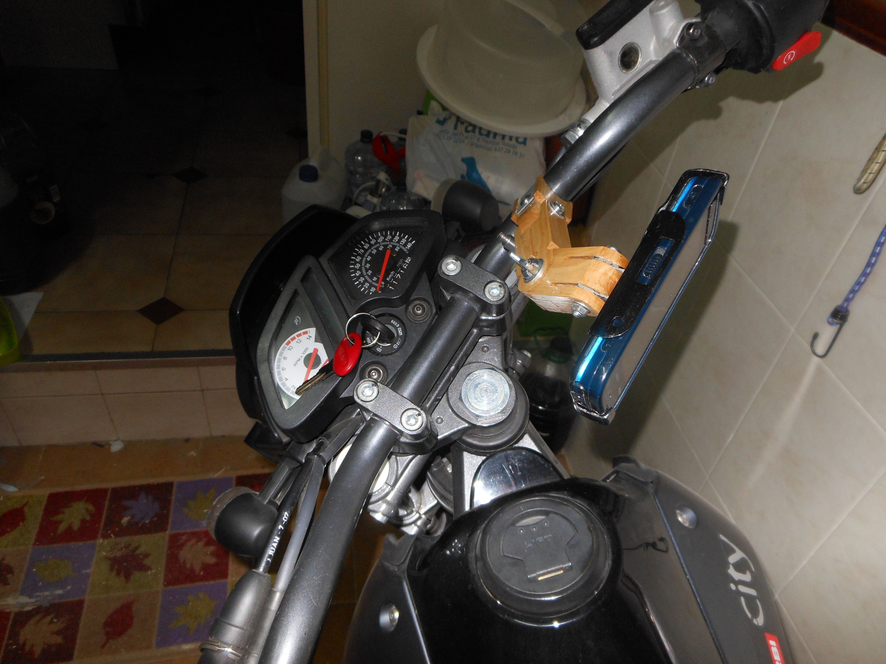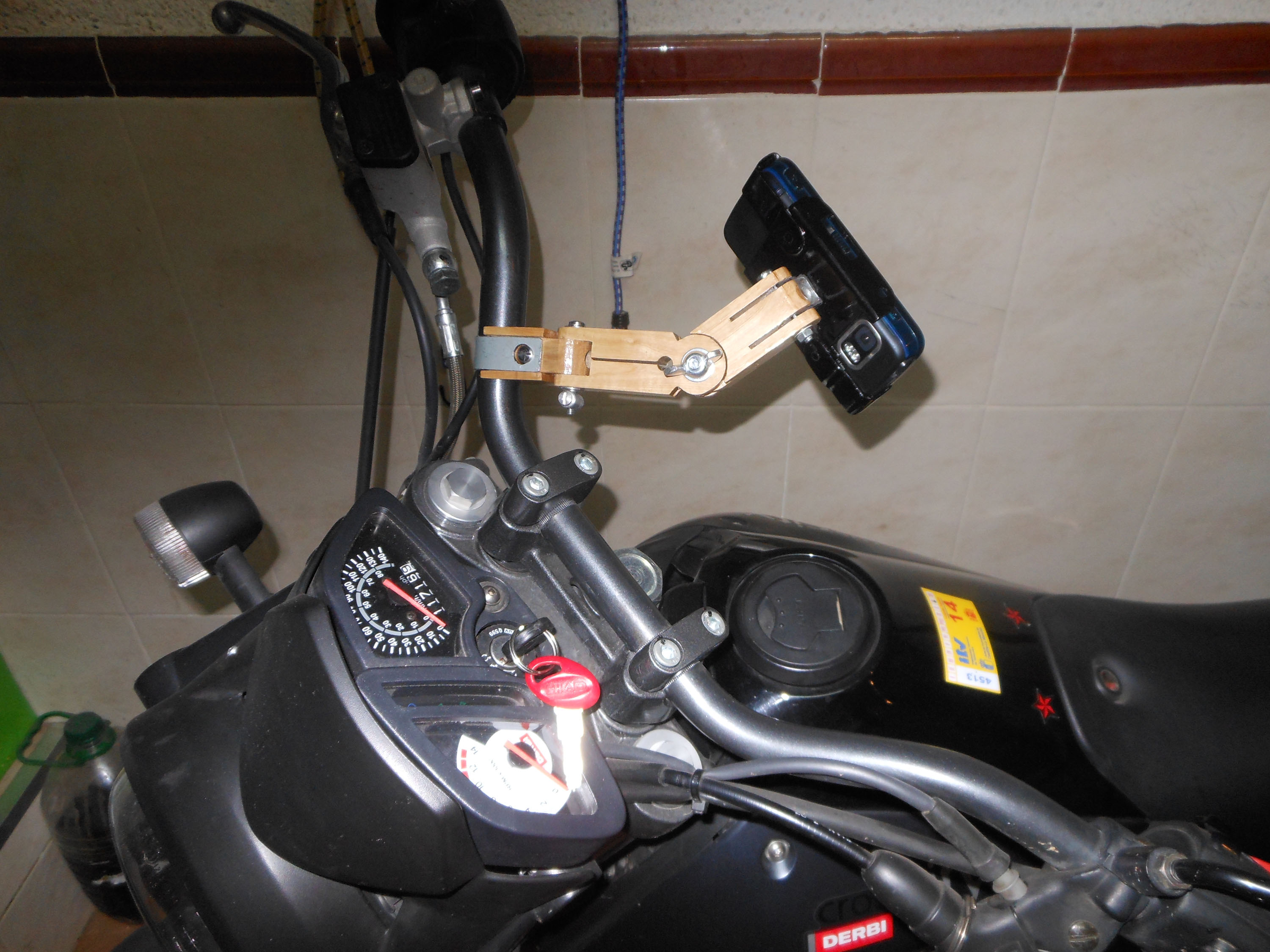 Soporte para mi moto Derbi Cross City montado sobre el manillar con una abrazadera para grabar videos en marcha, ó para utilizar como navegador el móvil Nokia 5800. Consta de abrazadera especial con tensor, brazo ajustable a la abrazadera y al soporte del móvil, soporte para el móvil con garras giratorias y rotación lateral. Construido con madera de oliva, piezas de chapa de hierro y tormillos.