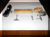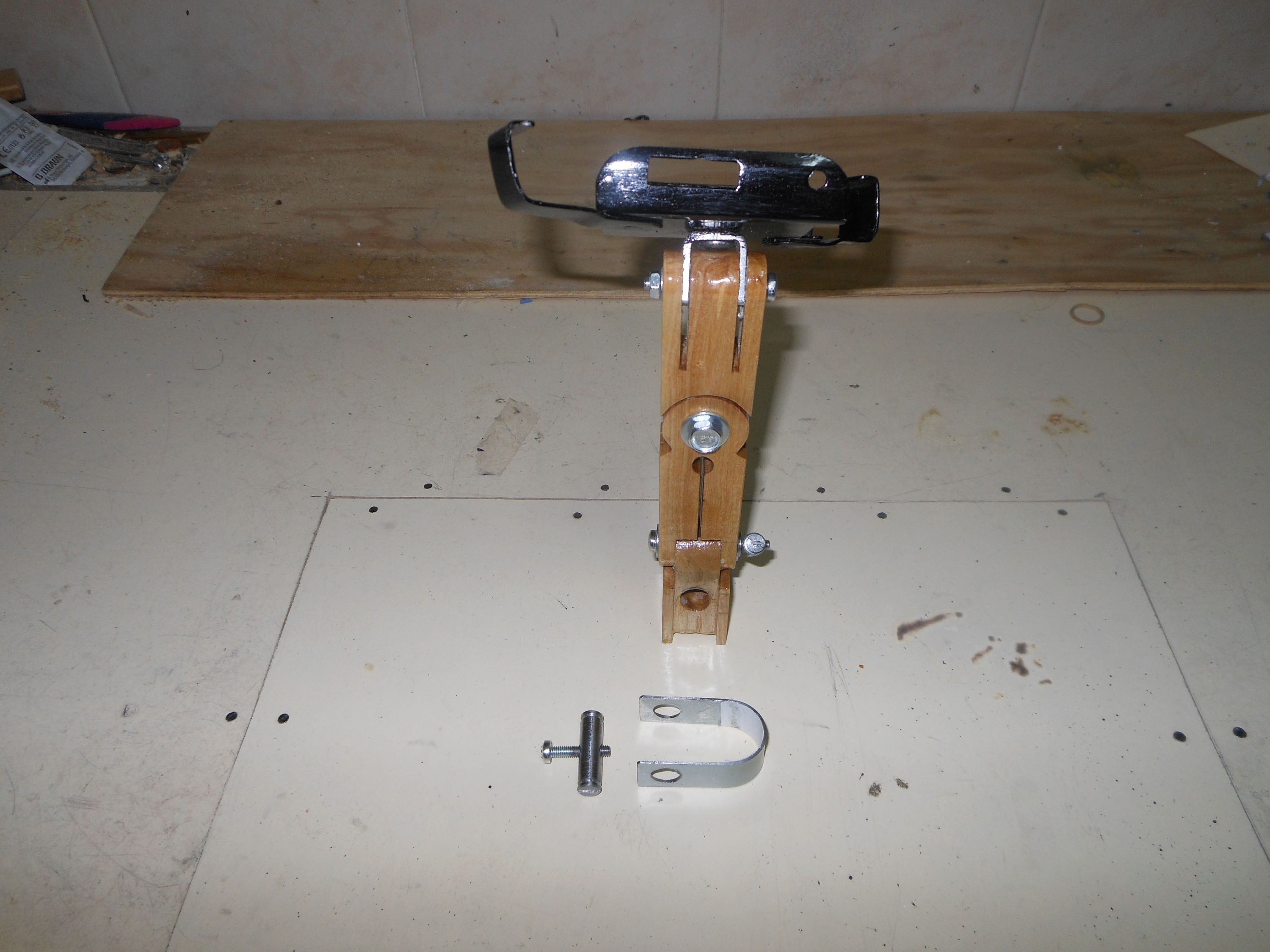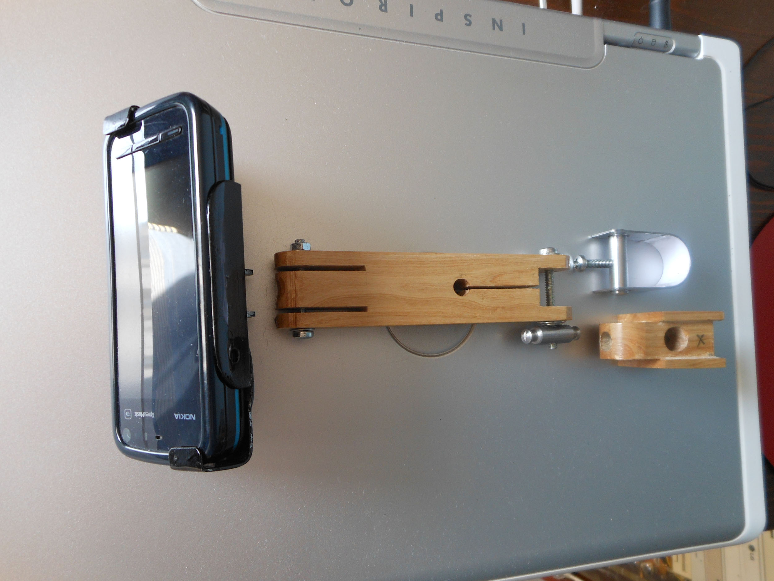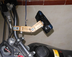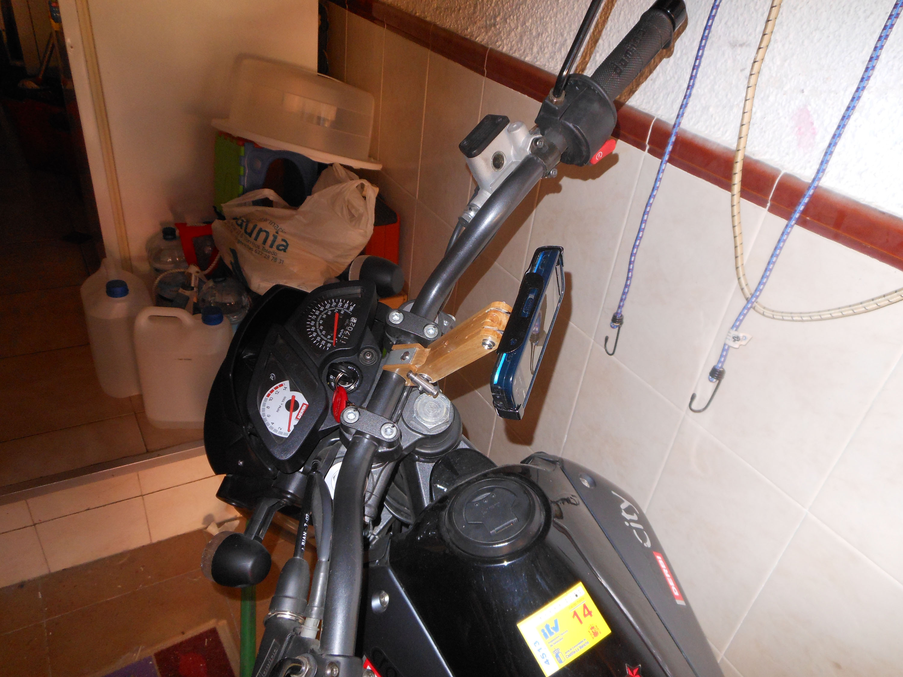 Soporte para mi moto Derbi Cross City montado sobre el manillar con una abrazadera para grabar videos en marcha, ó para utilizar como navegador el móvil Nokia 5800. Consta de abrazadera especial con tensor, brazo ajustable a la abrazadera y al soporte del móvil, soporte para el móvil con garras giratorias y rotación lateral. Construido con madera de oliva, piezas de chapa de hierro y tormillos.